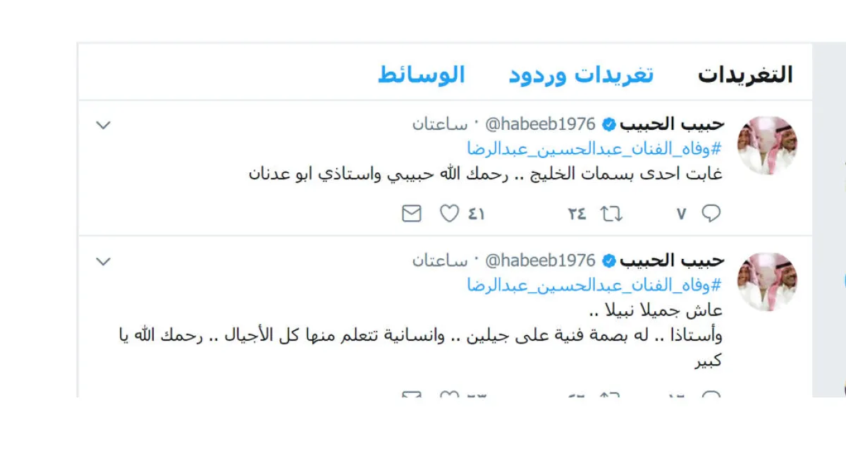 وغرد الفنان الحبيب ناعيًا: "عاش جميلًا نبيلًا ..وأستاذًا .. له بصمة فنية على جيلين .. وانسانية تتعلم منها كل الأجيال .. رحمك الله يا كبير ، ليتبعها: "‏غابت إحدى بسمات الخليج .. رحمك الله حبيبي واستاذي ابو عدنان "