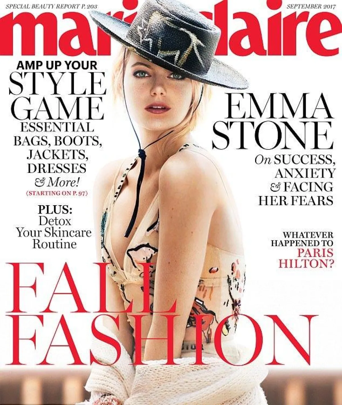 تصدرت النجمة العالمية إيما ستون Emma Stone، غلاف مجلة Marie Claire في عددها الجديد الخاص بشهر سبتمبر 2017، وجذبت الأنظار بإطلالة شقراء مستوحاة من زي رعاة البقر.