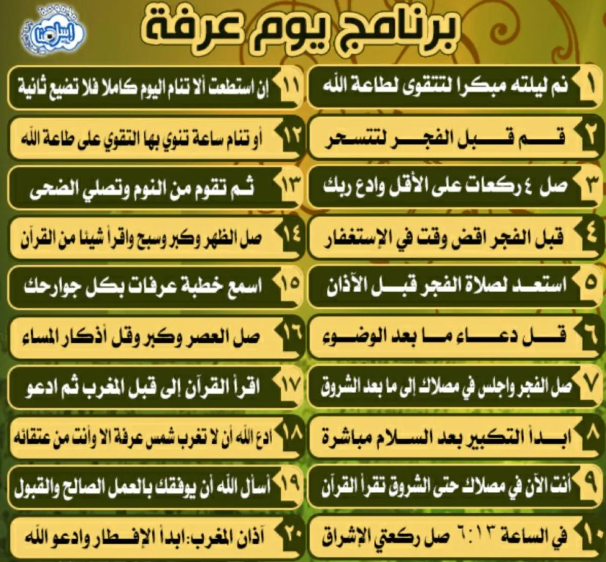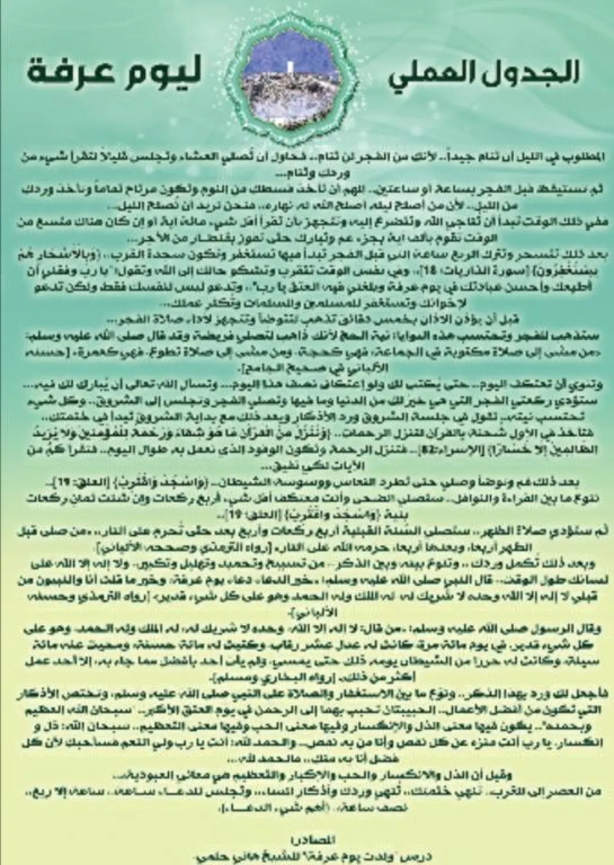 انتشر مؤخراً بين الناس وحجاج بيت الله الحرام مايعرف بـ«جدول يوم عرفة»، وهو عبارة عن مقترحات للعبادة، يتعين على الشخص القيام بها في هذا اليوم العظيم، الجدول أخذ اهتماماً كبيراً من قبل البعض منهم من زاد فيه أو نقص؛ رغبة منه في نشر الخير وتشجيع النفس على طاعة أكبر.