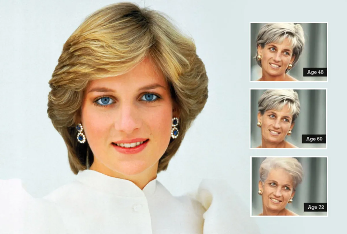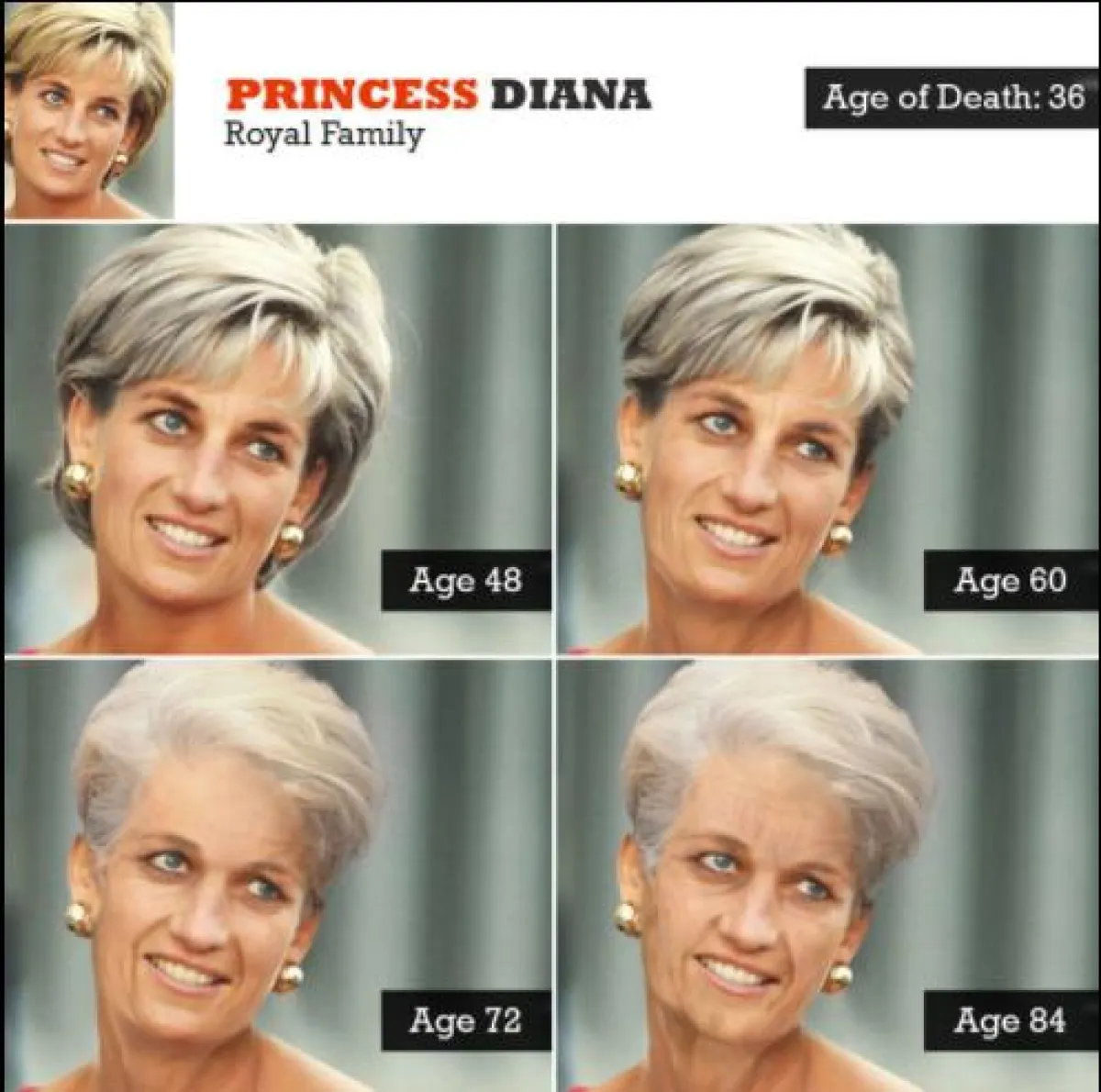 الأميرة ديانا Diana : رحلت وهي في عمر الـ36 عامًا في حادث سير، وظهرت في الصور في 4 مراحل عمرية هي 48، 60، 72 و80 عامًا.