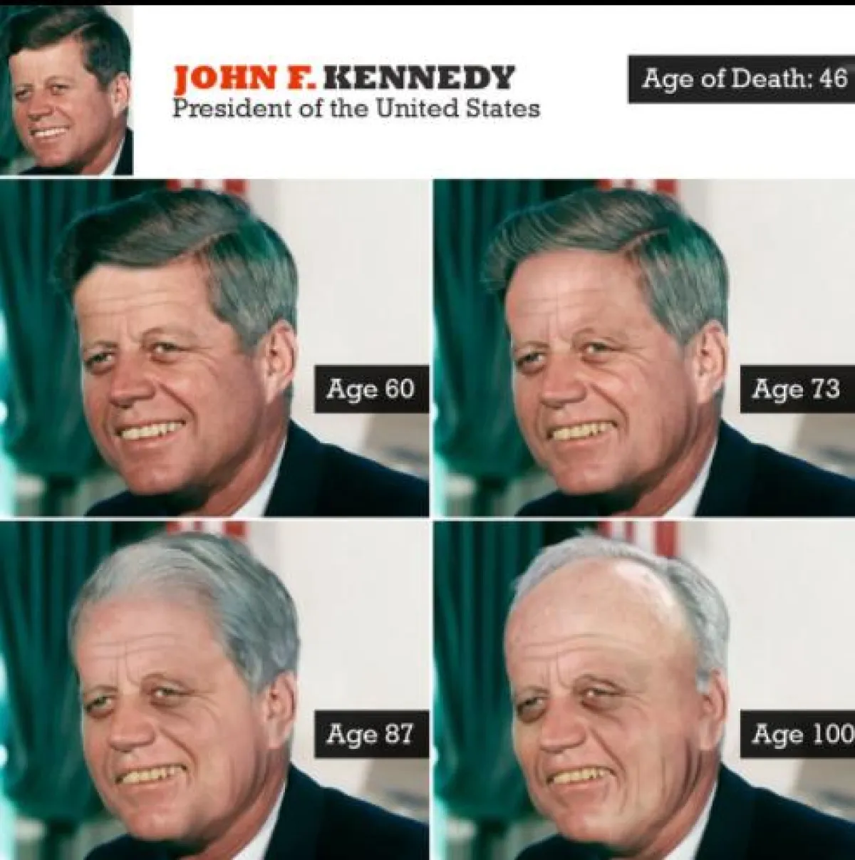 الرئيس الأمريكي جون كندي John F. Kennedy: توفي في عمر الـ46 عامًا، وأظهرته الصور بعمر 60، 73، 87 و100 عامًا.