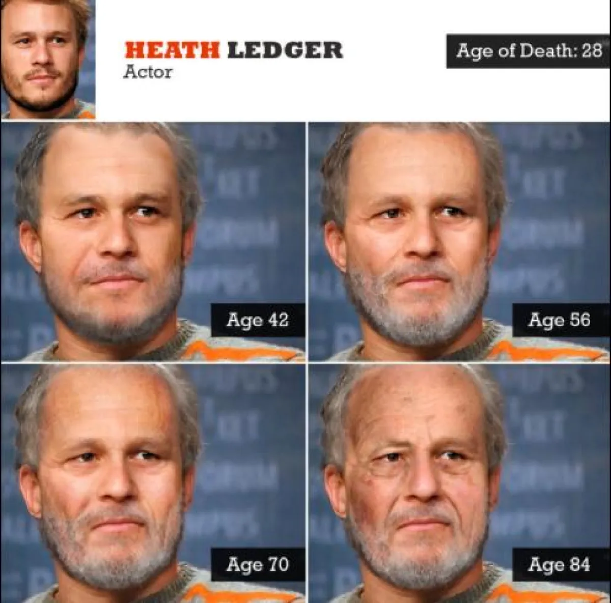 هيث ليدجر Heath Ledger: توفي بعد أن تناول جرعة زائدة من أدوية الأعصاب وهو في عمر 28 عامًا، وظهر في الصور بعمر 42، 60، 70 و84 عامًا.