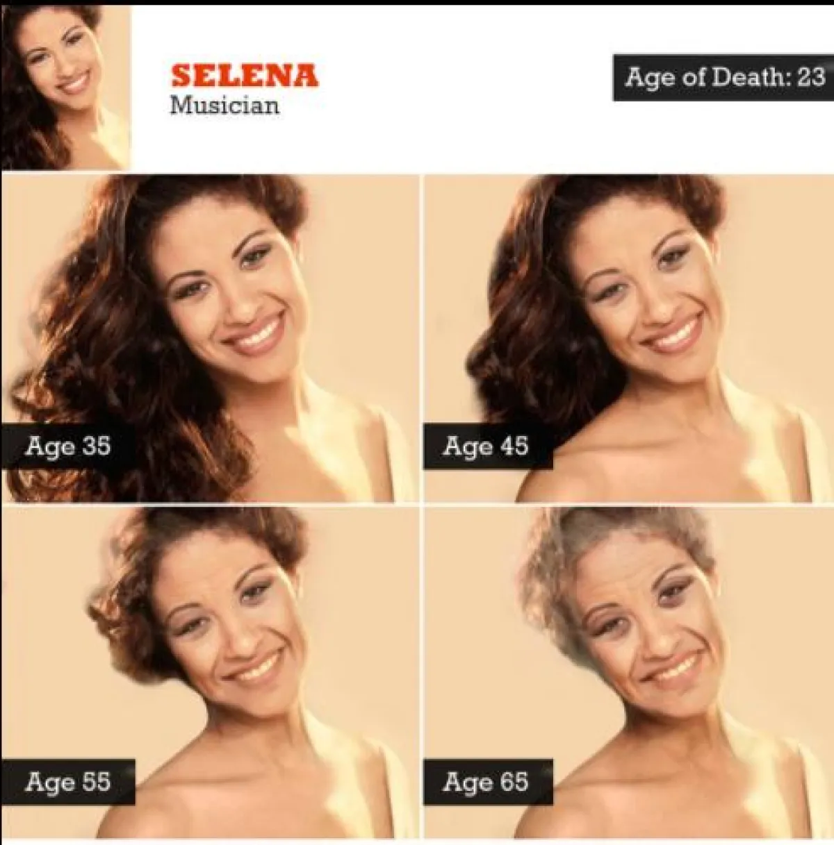 سيلينا Selena: قُتلت وهي في عمر الـ23 عامًا فقط، وتظهر في الصور وهي في عمر 35، 45، 55 و66 عامًا.