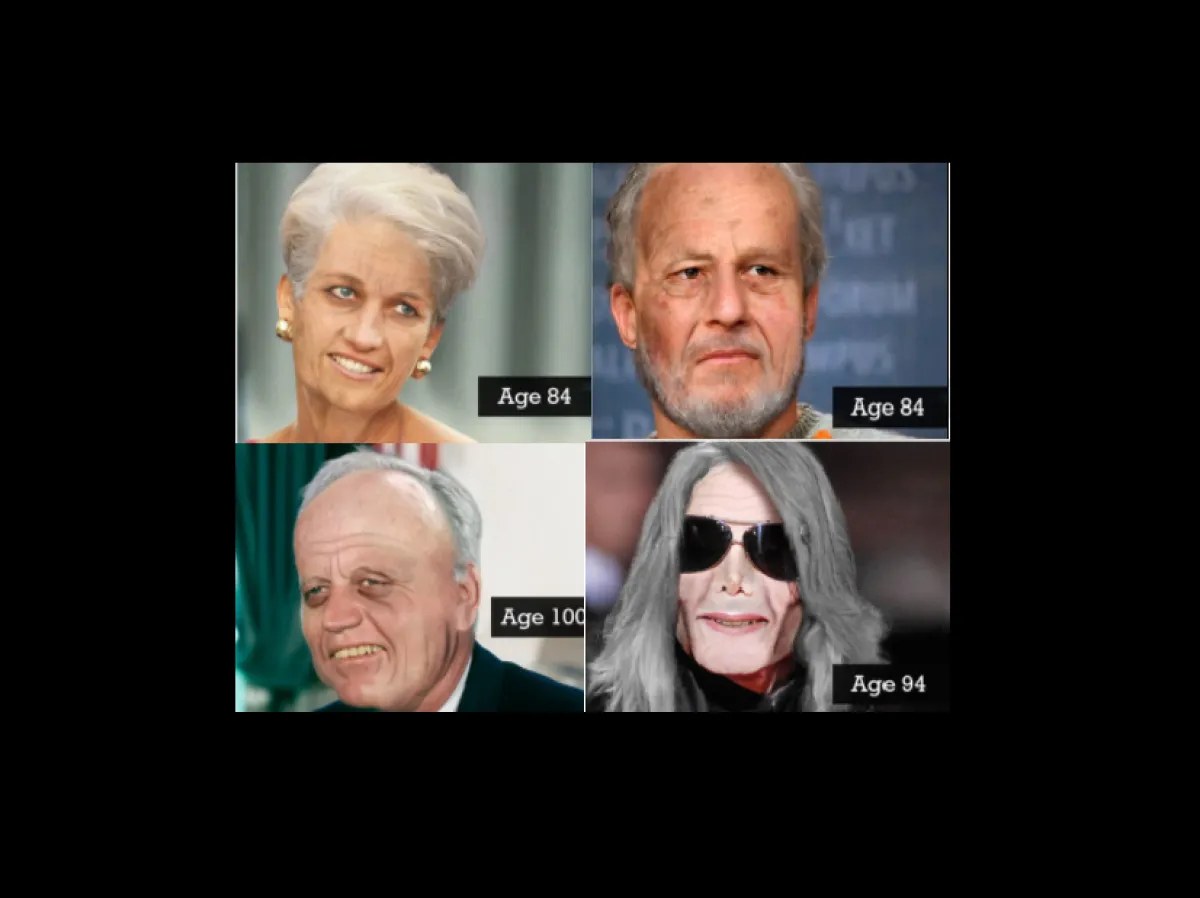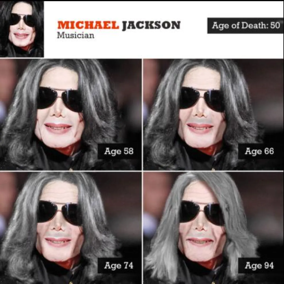 مايكل جاكسون Michael Jackson: توفي النجم الشهير بجرعة زائدة وهو في عمر الـ50 عامًا، وقد ظهر في الصور بعمر 58، 66، 74 و94 عامًا.