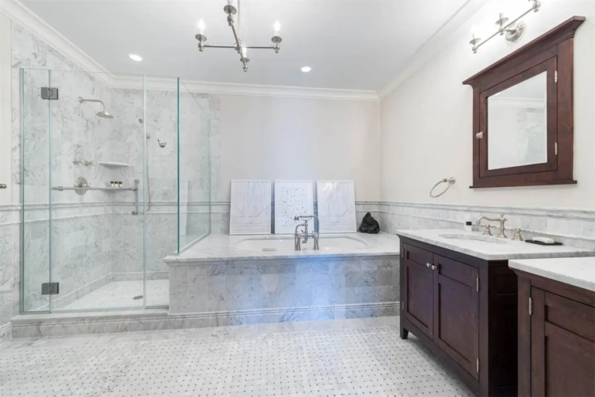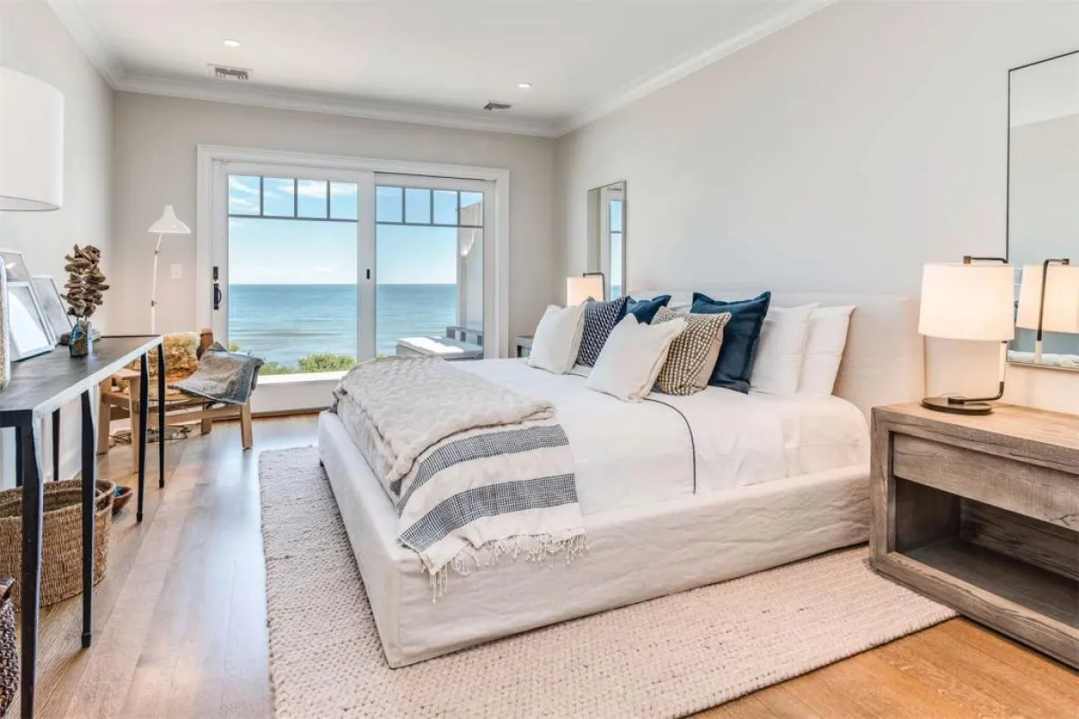 "ديكورات" غرفة النوم الرئيسة بسيطة، مع طغيان اللون الأبيض على الأساسيّات، وحضور مفرش ووسائد زرق على السرير. وفي الحمّام، يلعب الأبيض دور البطولة في توسيع المساحة، حيث يكسو الرخام حوض الاستحمام ومساحة الـ"دش" المنفصلة عنه بلوح من الزجاج الشفاف، فضلًا عن أسطح حوض الغسل.