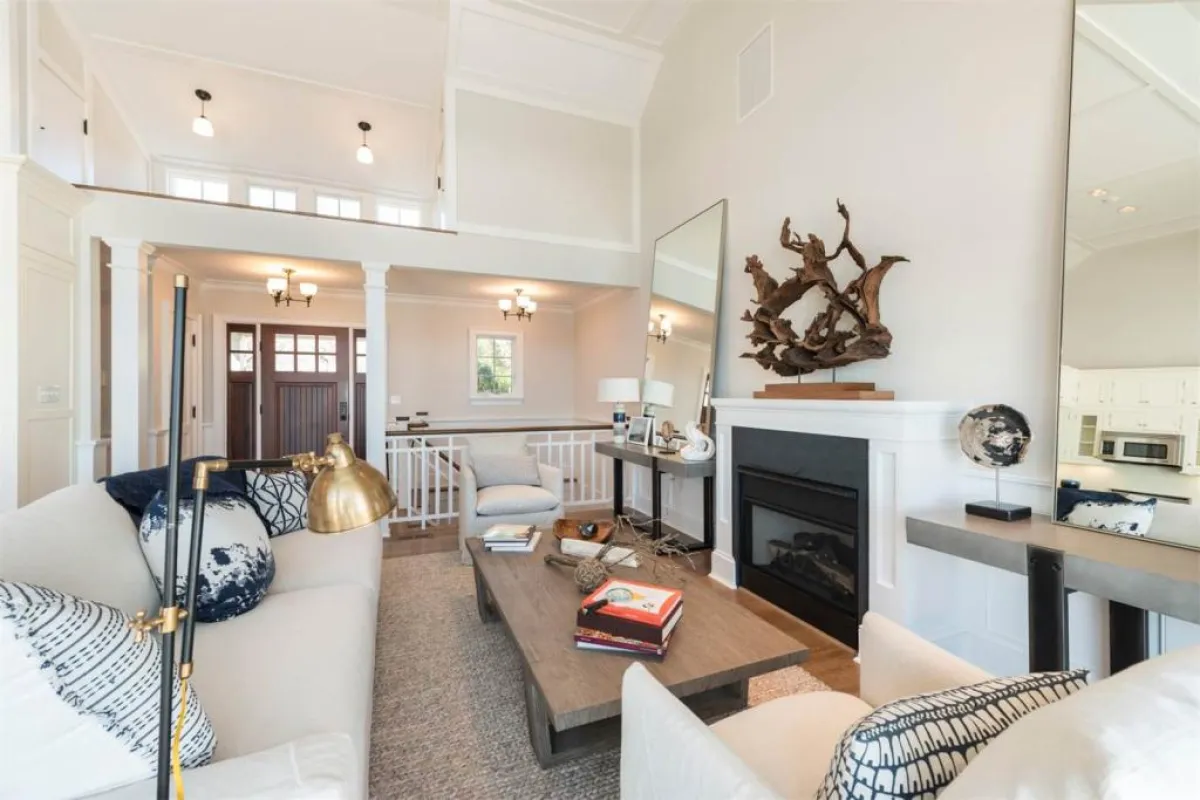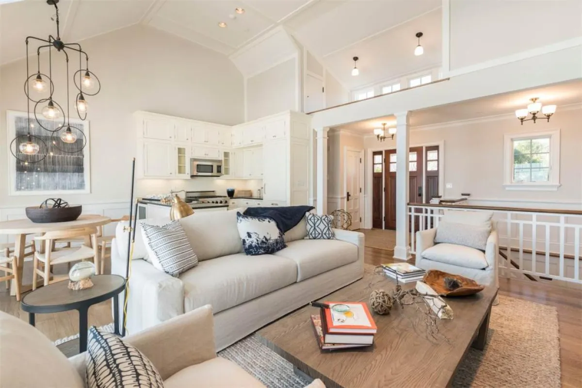 في الصالون، يتلوّن الأثاث بالرمادي الفاتح، فيما يتسلّل الأزرق إلى نقوش الوسائد، ويتصدّر الجلسة موقد عصري. وتعلوه تحفة خشب، توحي وكأنها مجموعة حطب. أمّا ركن الطعام فيحتلّ مساحة بين الصالون والمطبخ، ويقتصر أثاثه على طاولة دائرية مشغولة من الخشب غير المطلي، وتبدو الثريا المتدلاة فوقها نقطة الجذب في هذا الركن. ويكسو الخشب الأبيض، بدوره، خزائن المطبخ. وتساهم "الجزيرة/ الكاونتر" في تحديد مساحة المطبخ، وتزوّده بالخصوصية المطلوبة.