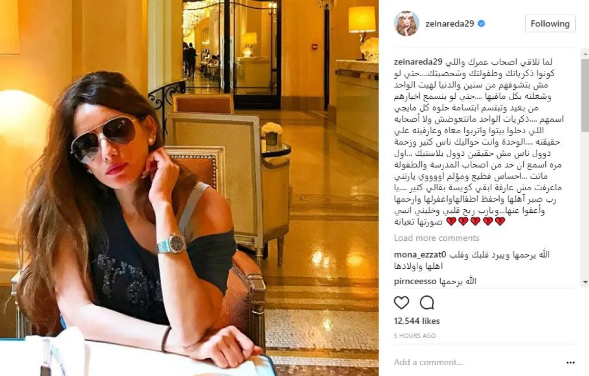 زينة رفضت نشر صورة صديقتها المتوفاة، كما رفضت نشر اسمها احترامًا لذكراها، واكتفت بنشر صورة لنفسها عبر حسابها الخاص بموقع انستقرام وعلّقت عليها قائلة: لما تلاقي اصحاب عمرك واللي كونوا ذكرياتك وطفولتك وشخصيتك....حتى لو مش بتشوفهم من سنين، والدنيا لهيت الواحد وشغلته بكل ما فيها ....حتى لو بنسمع اخبارهم من بعيد، وتبتسم ابتسامة حلوه، كل ما ييجي اسمهم ....ذكريات الواحد ما تتعوضش ولا أصحابه اللي دخلوا بيتوا واتربوا معاه وعارفينه على حقيقته ....الوحدة وانت حواليك ناس كتير وزحمة، دوول ناس مش حقيقيين دوول بلاستيك ...