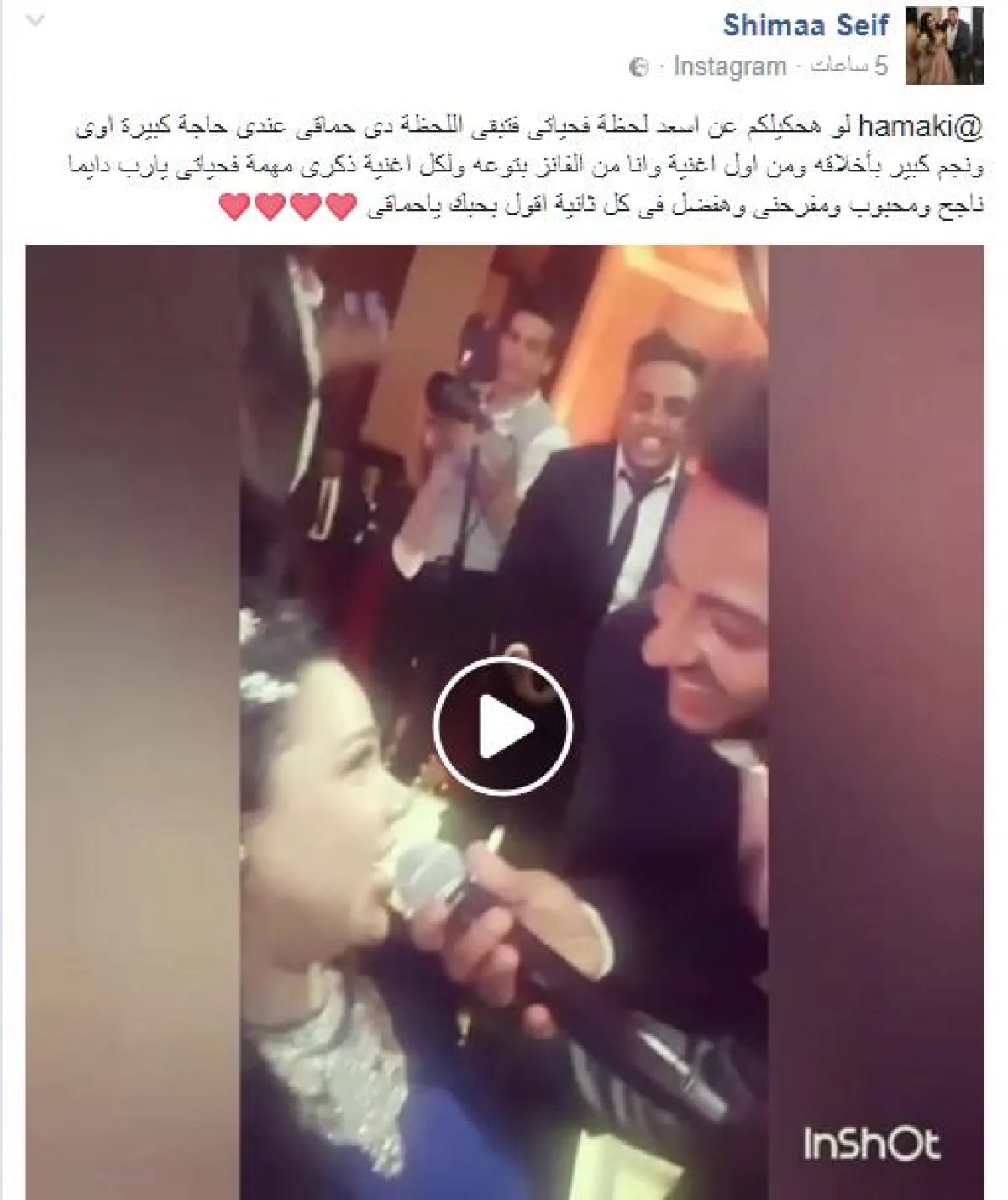 شيماء سيف اعترفت عبر صفحتها على موقع "فيس بوك" بأنها حققت أخيراً حلم حياتها، ونشرت مقطع الفيديو الذي يجمعها بالمطرب محمد حماقي وعلقت عليه قائلة: "لو هحكيلكم عن أسعد لحظة فحياتي فتبقى اللحظة دي حماقي عندي حاجة كبيرة أوي ونجم كبير بأخلاقه ومن أول أغنية وأنا من الفانز بتوعه ولكل أغنية ذكرى مهمة فحياتي يا رب دايما ناجح ومحبوب ومفرحني وهفضل في كل ثانية أقول بحبك يا حماقي".