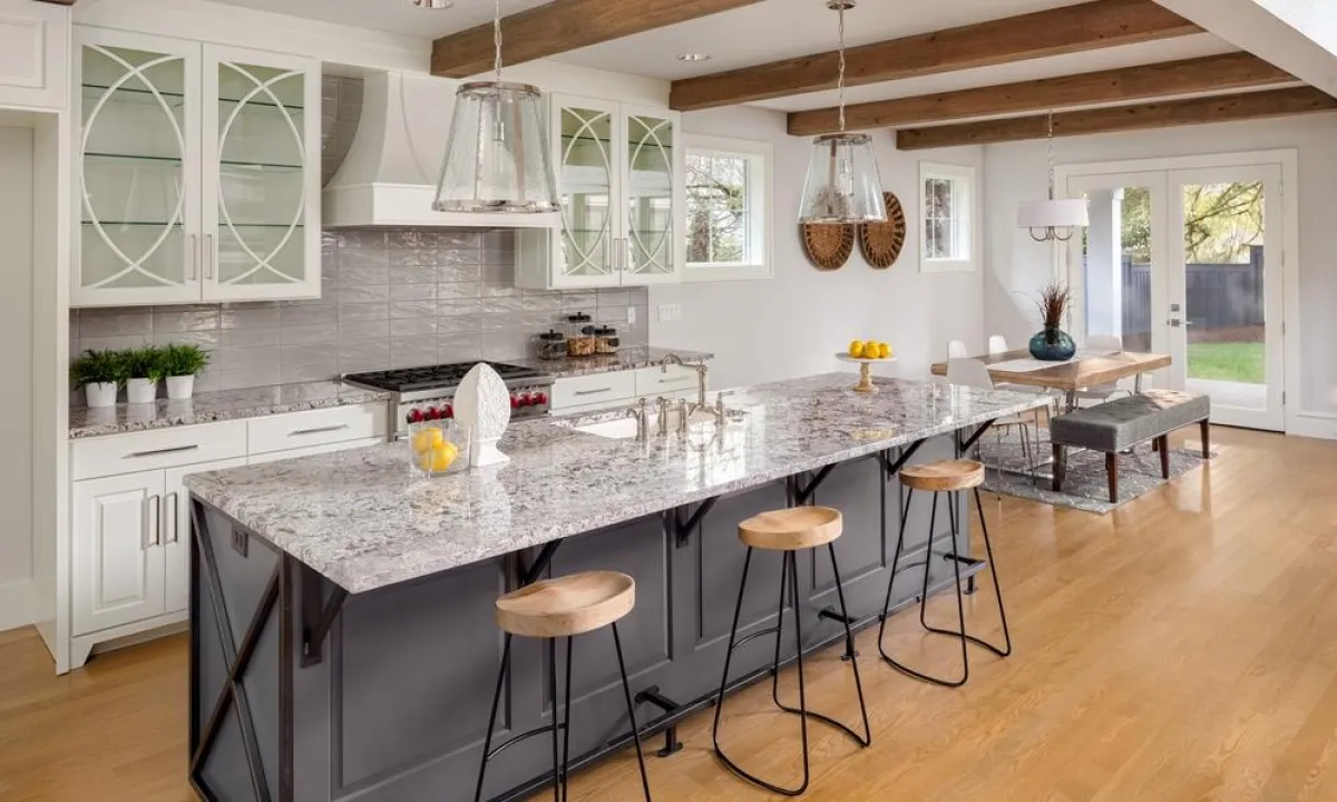 خليط من الخامات في تصميم المطبخ: الخشب في الخزائن، والرخام في سطح المجلى والـ"ستاينلس ستيل" في حوض الغسل