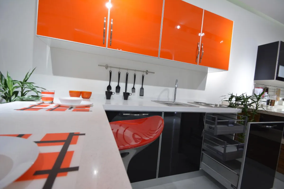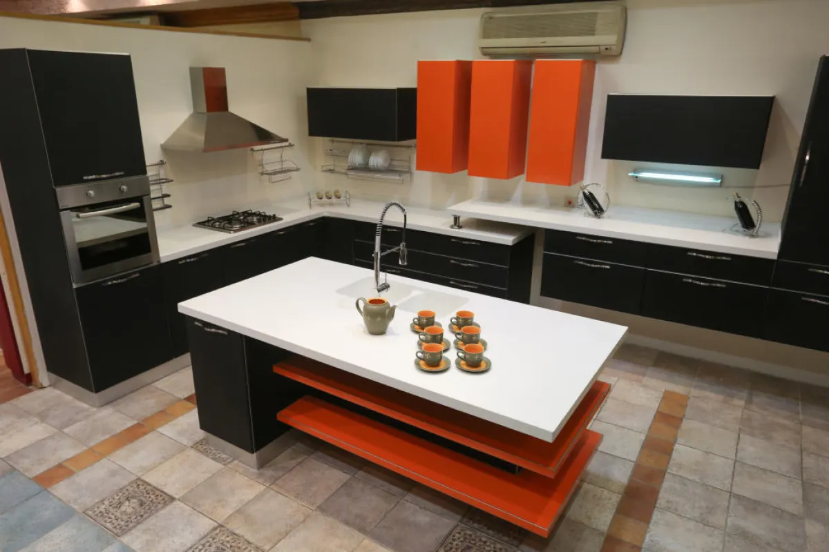 مطبخ من الـ"ألومينيوم"، بألوان الأسود والبرتقال والأبيض، وفيه طاولة مستطيلة الشكل ذات تصميم يصلها بحوض الجلي