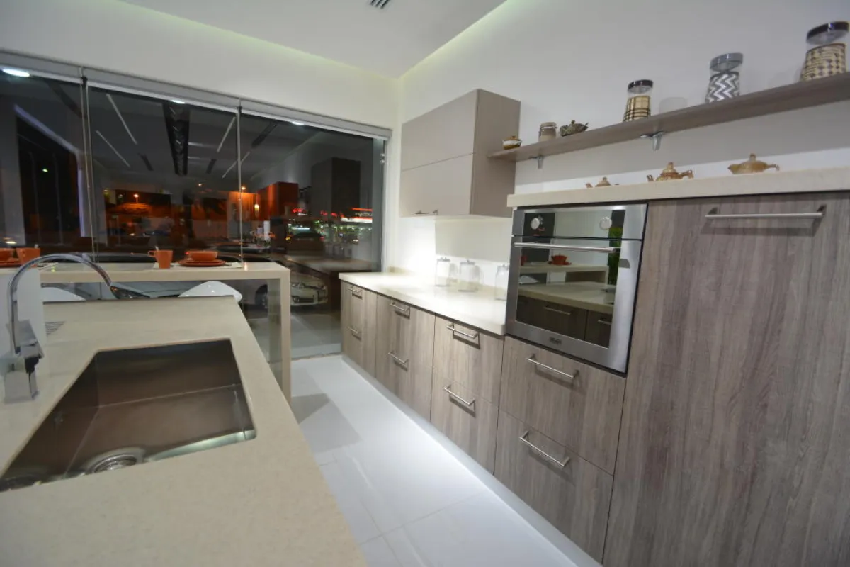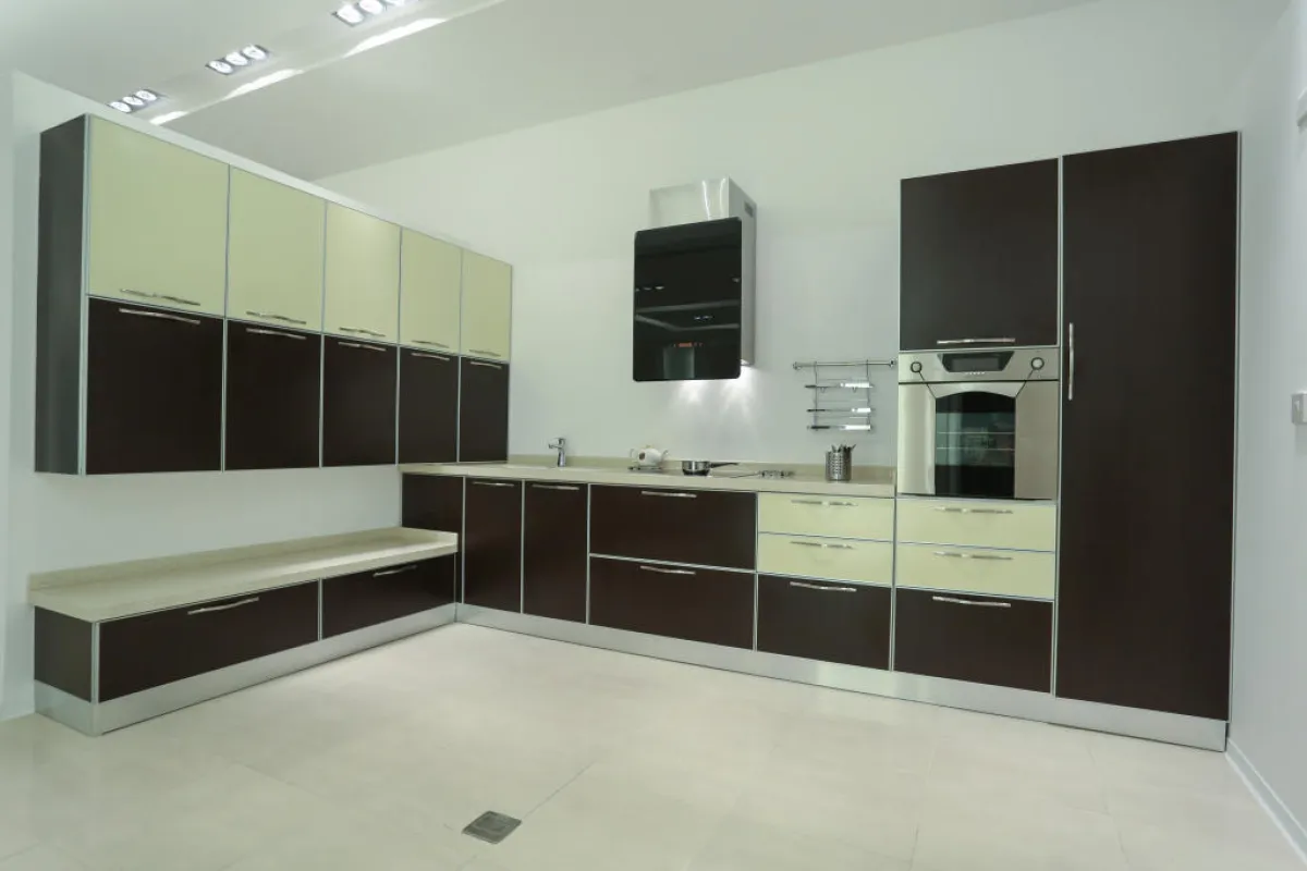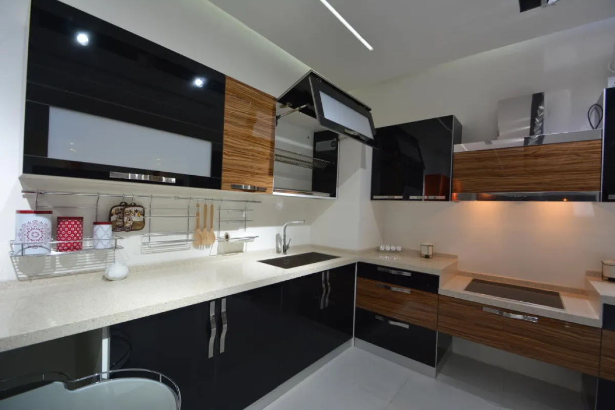 تصميم للمطبخ على شكل حرف الـ"يو" اللاتيني، ومن خامة "بي في سي"، بألوان الخشب والأسود والأبيض