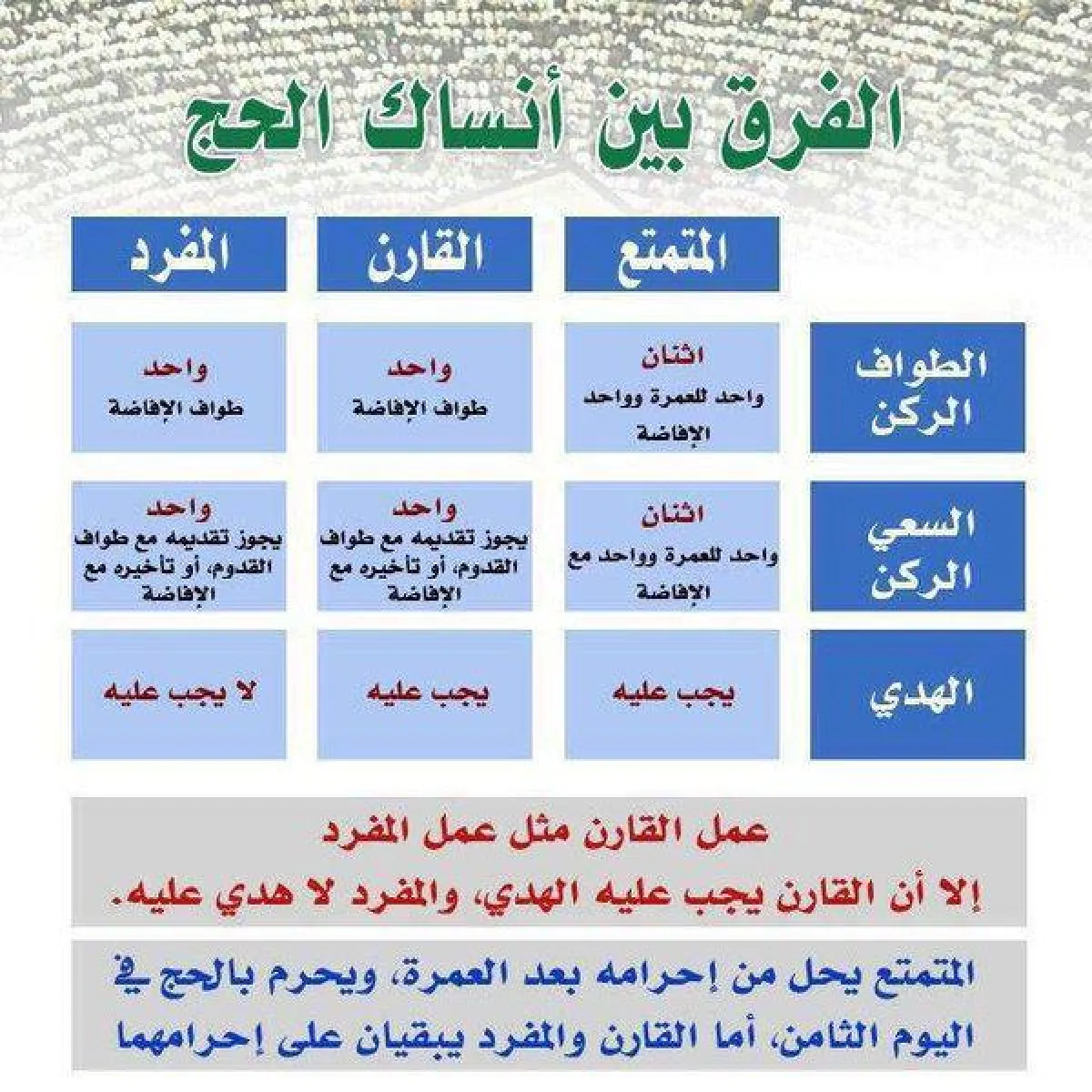 - حج القران: هو أن يحرم الإنسان بالحجّ والعمرة معًا، بحيث يقول: «لبّيك عمرةً وحجًّا»، أو يحرم بالعمرة أولاً، ثم يدخل الحجّ قبل البدء في الطواف. وعمل القارن كعمل المفرد سواء، إلا أنّ المفرد لا هديَ عليه، والقارن عليه هدي؛ لحصول النُّسْكَين له.