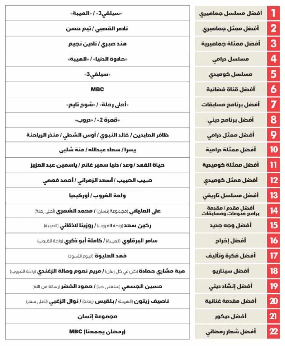 وفازت أيضاً محطة mbc عن فئة أفضل قناة فضائية في رمضان، وفاز مقدما البرامج علي العلياني ومحمد الشهري عن فئة أفضل مقدم برامج منوعات ومسابقات.