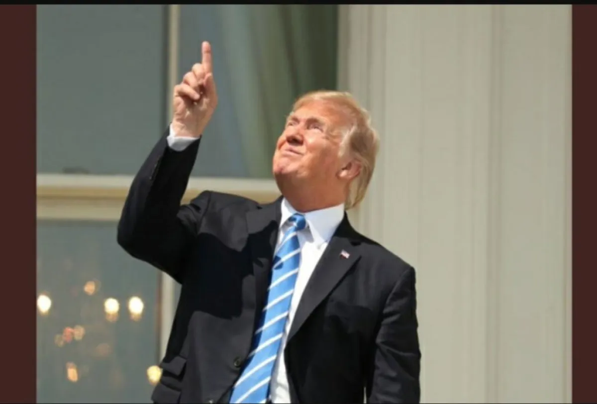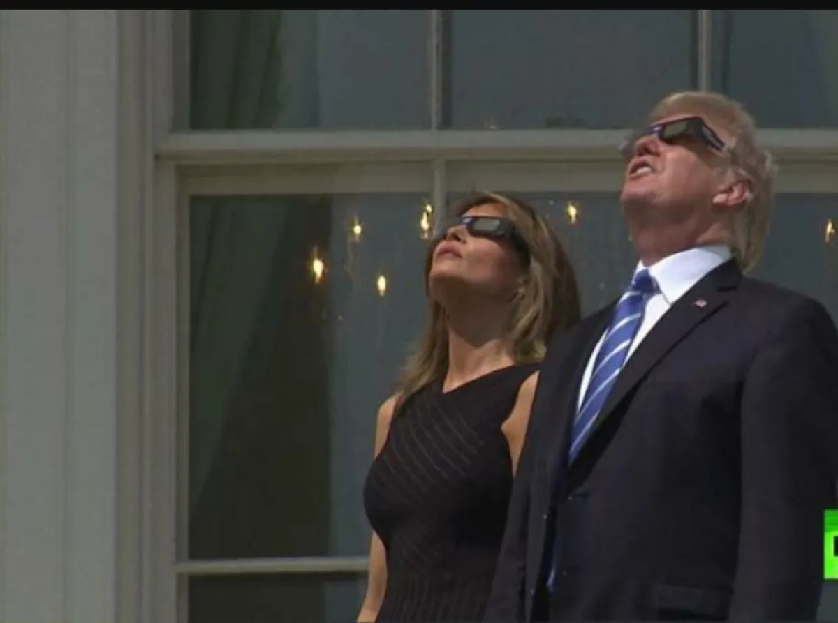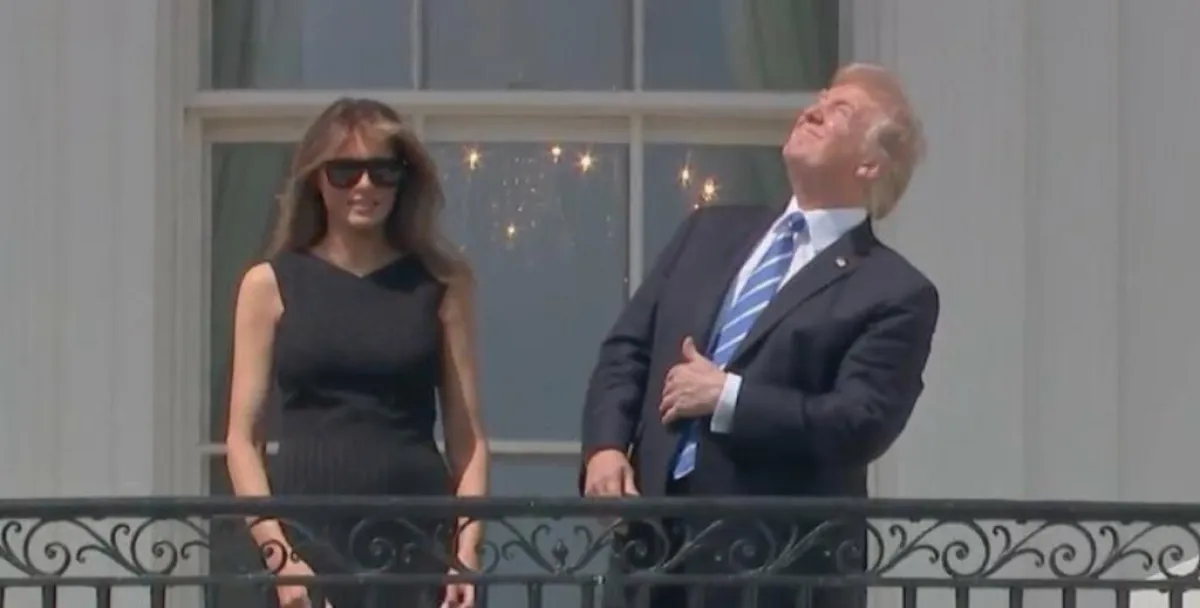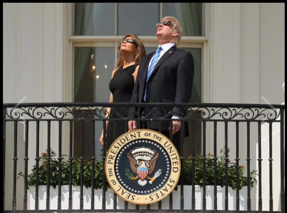 ويظهر في الصورة وقوف الرئيس الأمريكي دونالد ترامب وزوجته ميلانا على شرفة البيت الأبيض، بينما يرتديان النظارات وينظران إلى الأعلى لمشاهدة الكسوف الكلي النادر، الذي حدث اليوم في الولايات المتحدة.