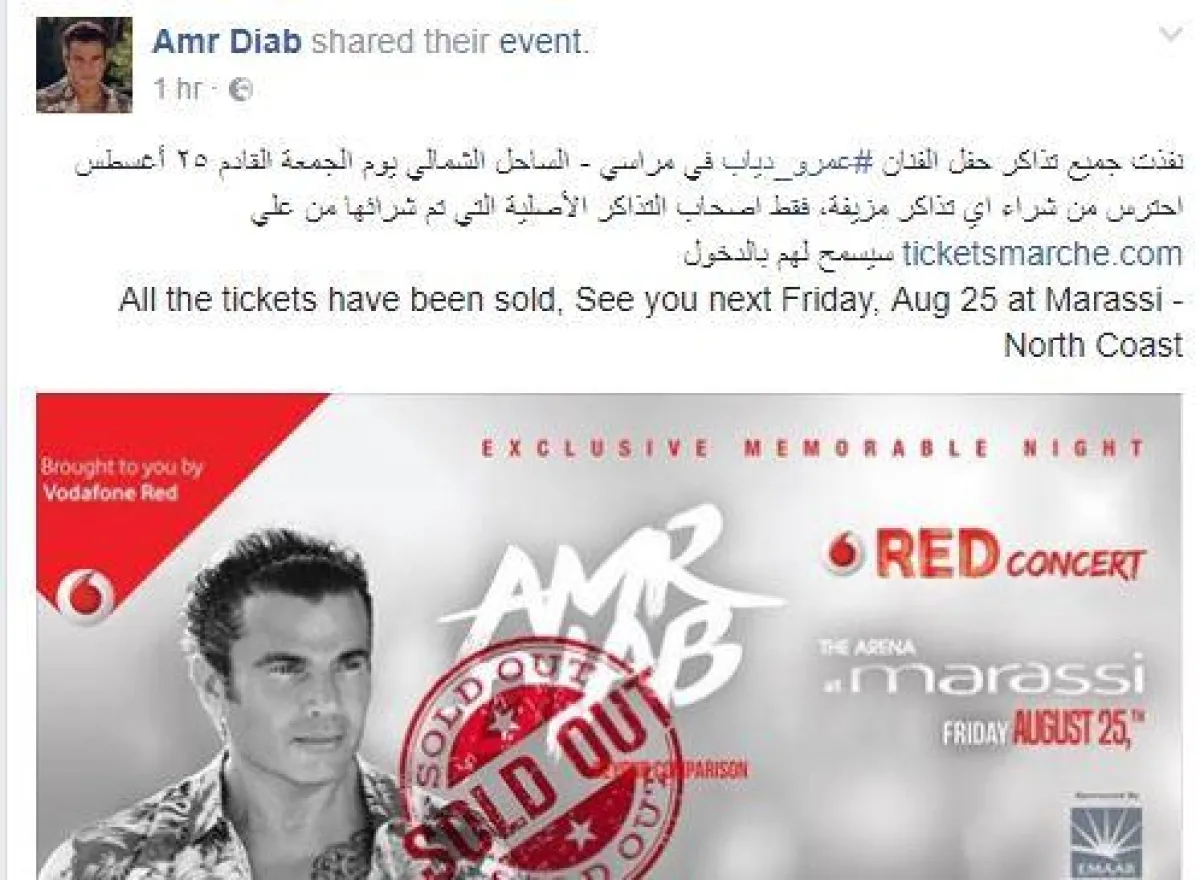 البيان الصادر عن المكتب الاعلامي للهضبة، أكد أولًا بيع كل تذاكر الحفل قائلًا: نفدت جميع تذاكر حفل الفنان عمرو دياب في مراسي _ الساحل الشمالي، الجمعة المقبل ٢٥ أغسطس.