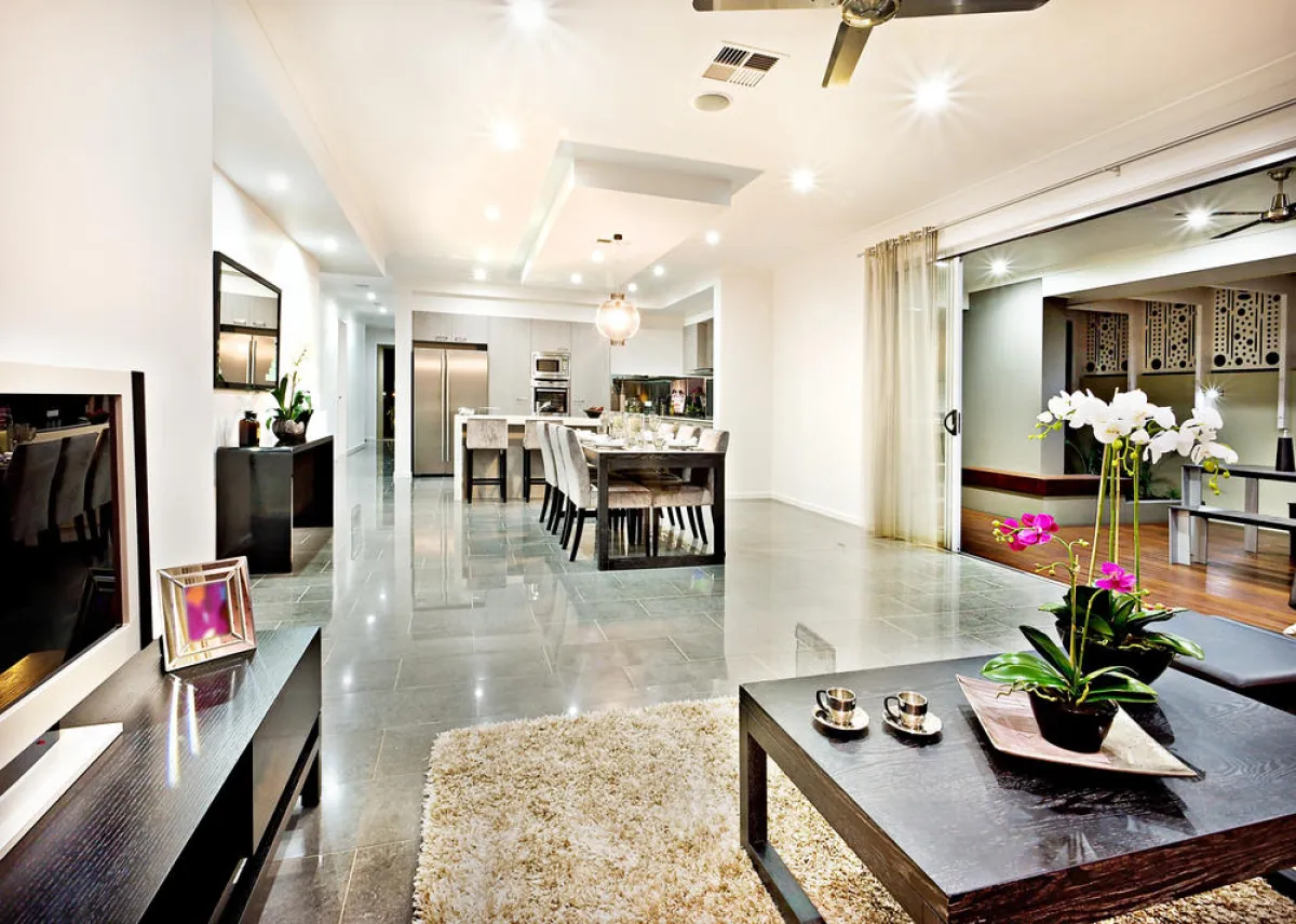 للطاولة الرئيسة: يحلو ترتيب زهرية تملؤها الأزهار والأغصان الخضر لإنعاش الإطلالة، بالإضافة إلى صندوق لحفظ الأشياء الصغيرة واليوميّة، على أن يكون أنيقًا وفي الوقت نفسه عمليًّا. وتتطلّب علبة المناديل أن تُختار بعناية، فضلًا عن حافظة السكاكر، مع توزيع الكتب والمجلّات بطريقة عشوائيّة.