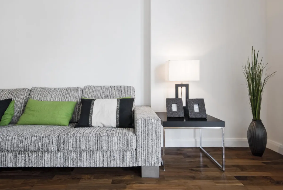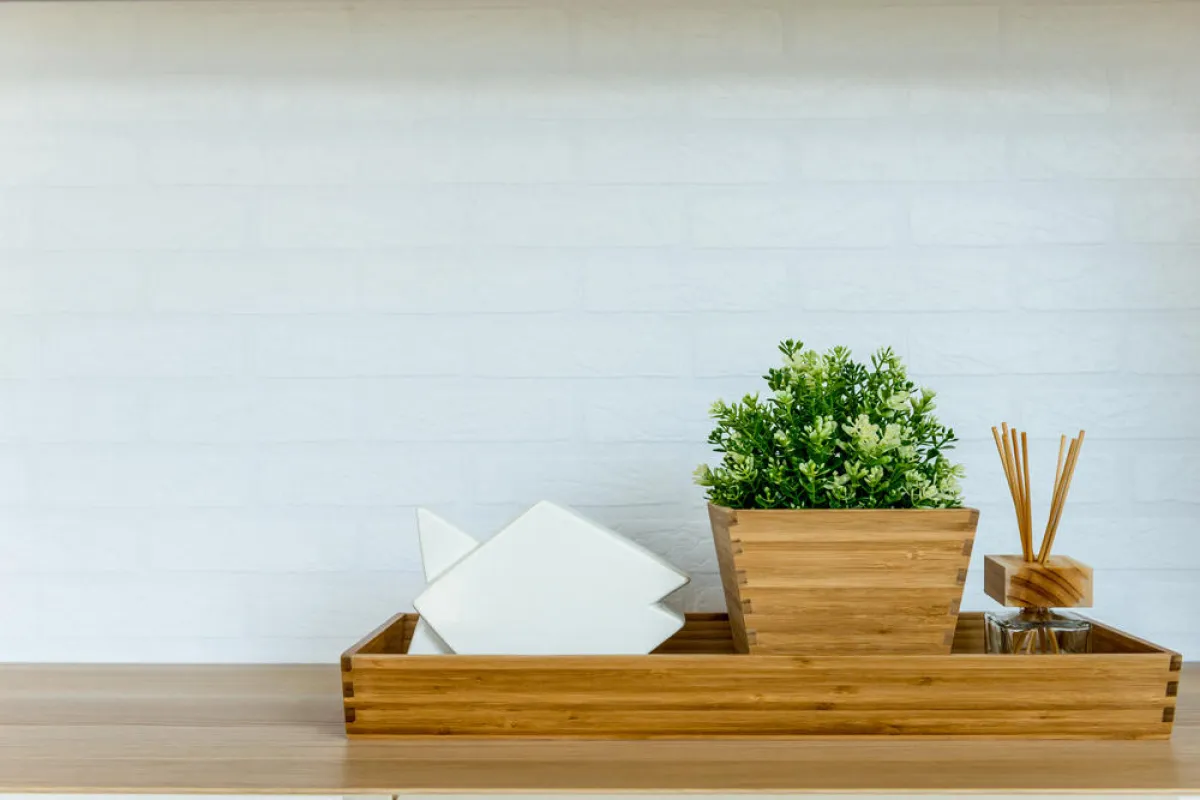 للطاولة الجانبية في الصالة: يُستحسن اختيار بروازين بحجمين متفاوتين، وزهرية متوسطة الحجم مزينة بنبتة الـ"بامبو" وصندوق وتحفة ذات حجم صغير، مع إيداع مساحة خالية من الطاولة للضيافة.