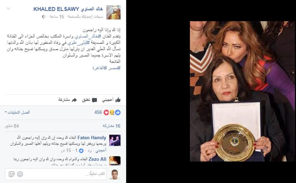 النجم خالد الصاوي كتب بيانًا لرثاء الفقيدة عبر حسابه الشخصي بموقع الفيس بوك قائلًا: إنّا لله وإنّا إليه راجعون، يتقدم الفنان خالد الصاوي وأسرة المكتب بخالص العزاء إلى الفنانة الكبيرة والصديقة # ليلى علوي، في وفاة المغفور لها بإذن الله والدتها.