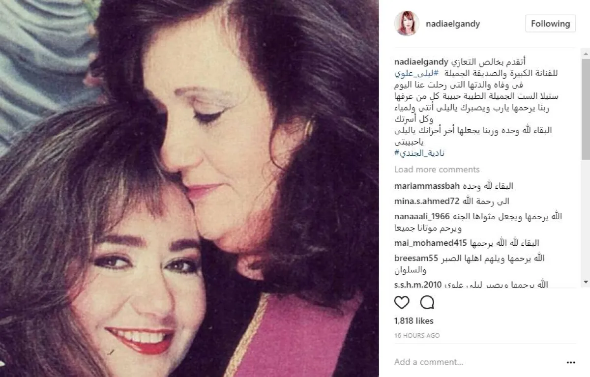 الفنانة نادية الجندي، ودّعت والدة الفنانة ليلى علوي عبر انستقرام أيضًا وكتبت: أتقدم بخالص التعازي للفنانة الكبيرة والصديقة الجميلة ليلى علوي، في وفاة والدتها التي رحلت عنّا اليوم.. ستيلا الست الجميلة الطيبة حبيبة الكل، ربّنا يرحمها يا رب ويصبّر ليلى لتعلّقها الشديد بأمّها، البقاء لله وربّنا يجعلها آخر أحزانك يا ليلى".