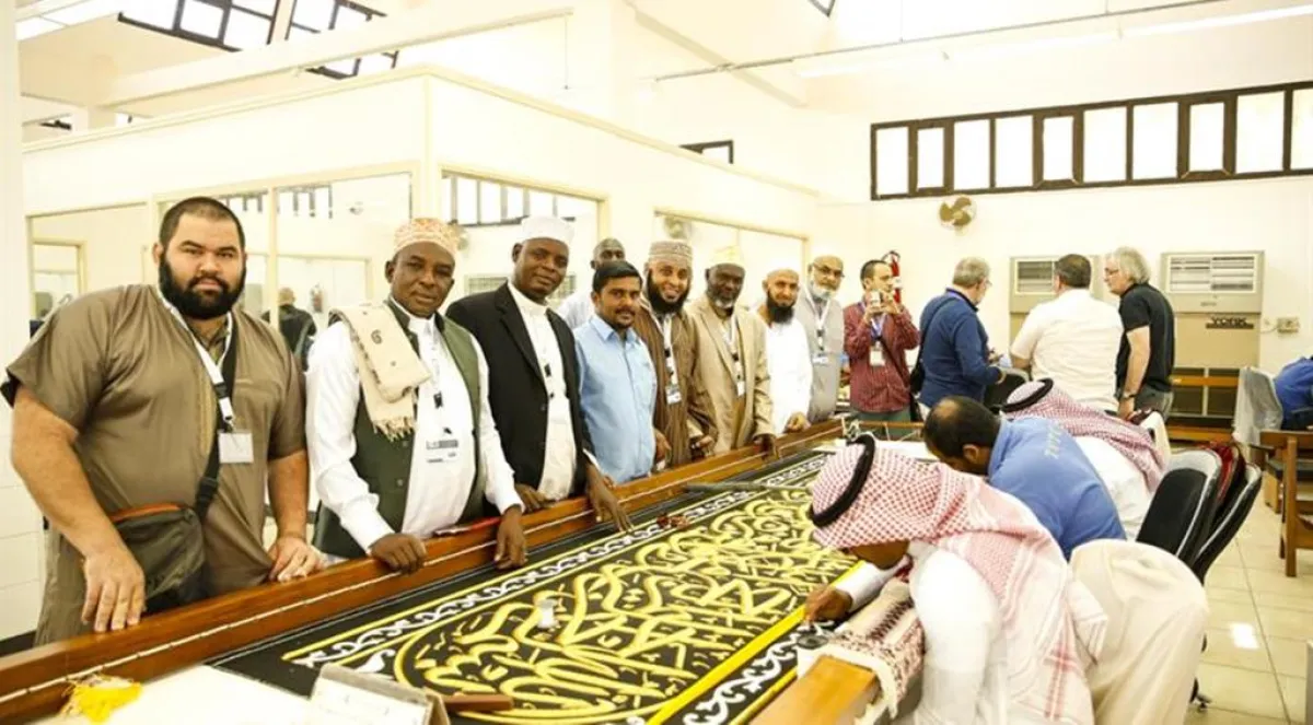 واستمع الضيوف إلى شرح من المسؤولين عن تاريخ صناعة كسوة الكعبة، والمواد المستخدمة في صناعتها، حيث أوضح المسؤولون أن الكسوة مصنوعة من أجود أنواع الحرير الخالص المستورد، وهي مطرزة بخيوط ذهبية وفضية، ويتم تغيير القماش مرة واحدة في العام في احتفال خاص، مشيرين إلى أنه يستخدم في ثوب الكعبة أجود أنواع الخيوط من الحرير، فضلاً عن مواضع الذهب والفضة التي يتم استخدامها للتطريز، حيث تصل حزم الحرير الخام إلى مصنع الكسوة ويتم غسلها ثلاث مرات لإزالة طبقة الشمع عنها.