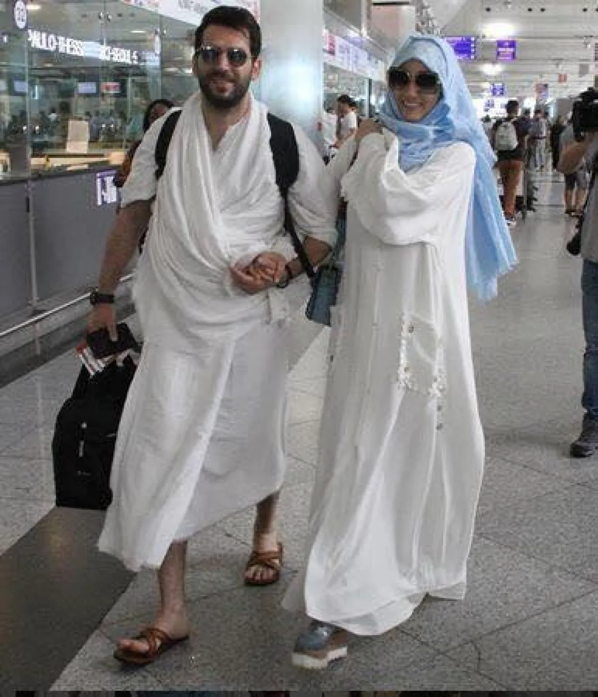 وتظهر الصور التي تم التقاطها من مطار إسطنبول يلديرم وهو يرتدي ملابس الإحرام، فيما غطت الباني رأسها وارتدت إلى جانب زوجها نظارة شمسية.