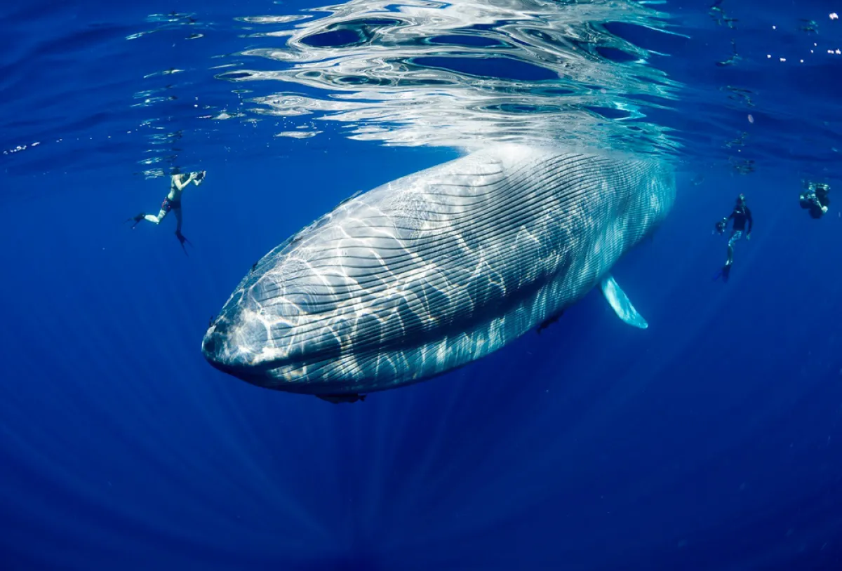 يُعد أكبر الحيوانات المعروفة على الإطلاق؛ بسبب طوله البالغ 30 متراً، ووزنه البالغ أكثر من 170 طناً، ويقدر أن هناك ما بين 5000 و12000 من الحيتان الزرقاء لا تزال تعيش في جميع أنحاء العالم، وذلك بسبب الصيد الجائر الذي تعرضت له من قبل الصيادين.