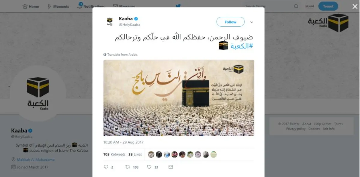 واستهل الحساب تغريداته برمز تعبيري للكعبة المشرفة، وتعليق بأنها رمز السلام لدين الإسلام، مع صورة كُتِبَت عليها الآية الكريمة: "وإذ جعلنا البيت مثابة للناس وأمناً".