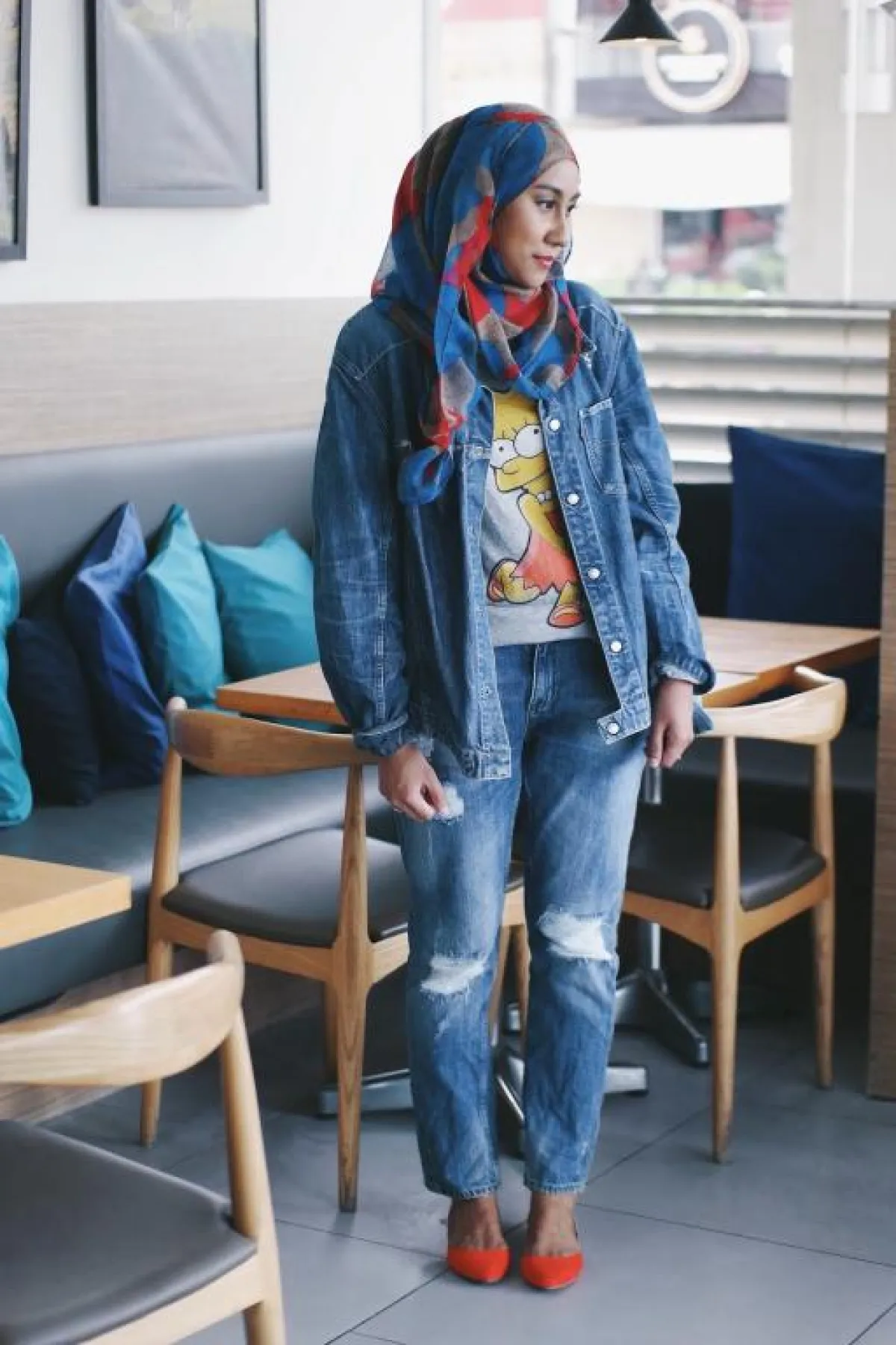 -اعتمدي ربطة حجاب بسيطة وطرحة غير مطبّعة، كاجوال وناعمة. أما إذا كانت اطلالتكِ باللون الواحد، فإنّ بإمكانكِ اختيار غطاء رأس مطبّع بنقش يجمع ألوان اطلالتكِ والجاكيت.