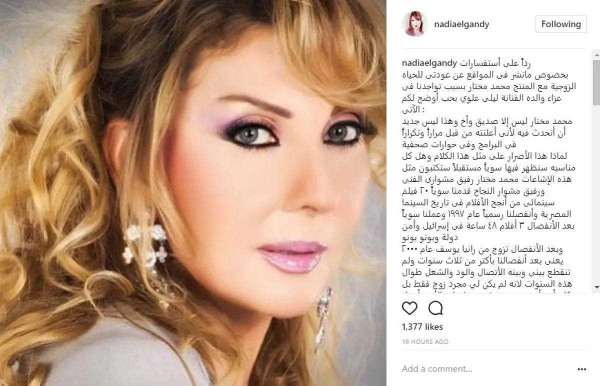التوضيح نشرته نادية الجندي عبر حسابها الخاص بموقع انستقرام قائلة: ردًّا على استفسارات بخصوص ما نُشر في المواقع عن عودتي للحياة الزوجية مع المنتج محمد مختار، بسبب وجودنا في عزاء والدة الفنانة ليلى علوي، بحب أوضح لكم الآتي: محمد مختار ليس إلّا صديق وأخ، وهذا ليس جديدًا أن أتحدث فيه لأني أعلنته من قبل مرارًا وتكرارًا.