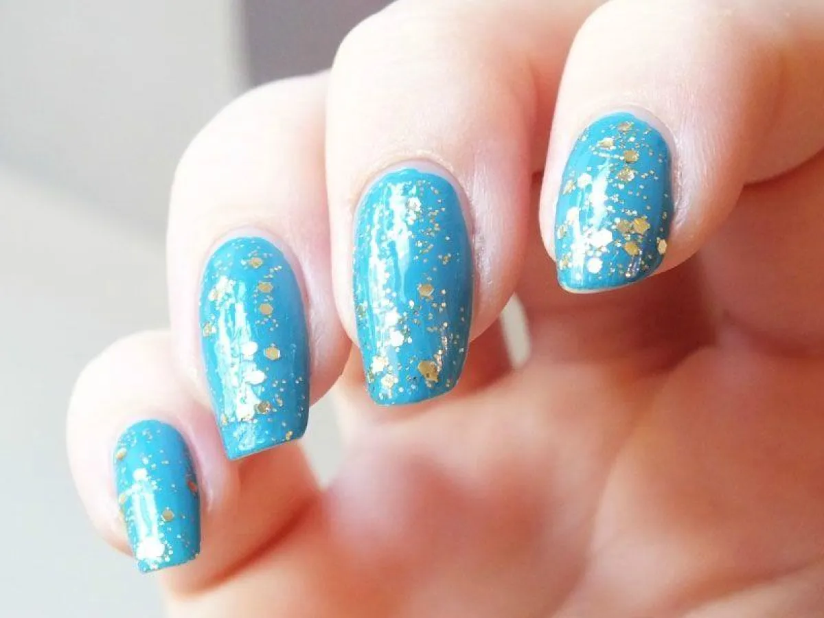 • كل ما عليك فعله هو تطبيق طلاء الأظافر باللون الأبيض أولاً، من ثم تطبيق الأزرق الداكن الموحّد، أو الفاتح مع بعض النقاط الذهبية والفضية والمبعثرة التي تظهر أظافرك على نحو فني جذاب.