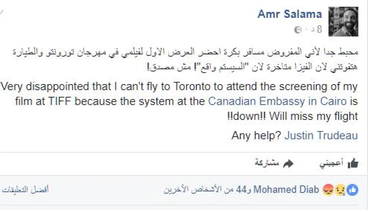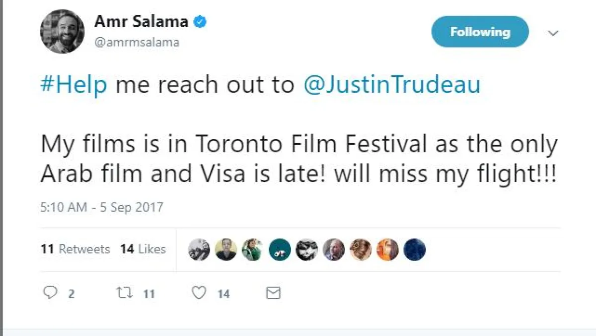 لم يجد المخرج عمرو سلامة صاحب المشاركة العربية الوحيدة في مهرجان تورنتو السينمائي الدولى، حلاً لإنقاذه من ورطة عدم استخراج تأشيرة السفر، الا أرسال برقية استغاثة عبر موقع التغريدات تويتر لجاستين ترودو، يخبره فيها أن الطائرة ستغادر مطار القاهرة بدونه لأن التأشيرة لم تصدر بعد.
