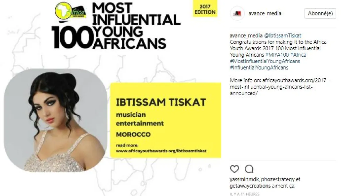أعلنت منظمة جوائز إفريقيا للشباب التي تهتم وتشجع أعمال الشباب للمرة الثانية عن قائمتها السنوية التي تضم 100 شاب الأكثر تأثيراً لعام 2017 في القارة الإفريقية بينهم الفنانة المغربية ابتسام تسكت.