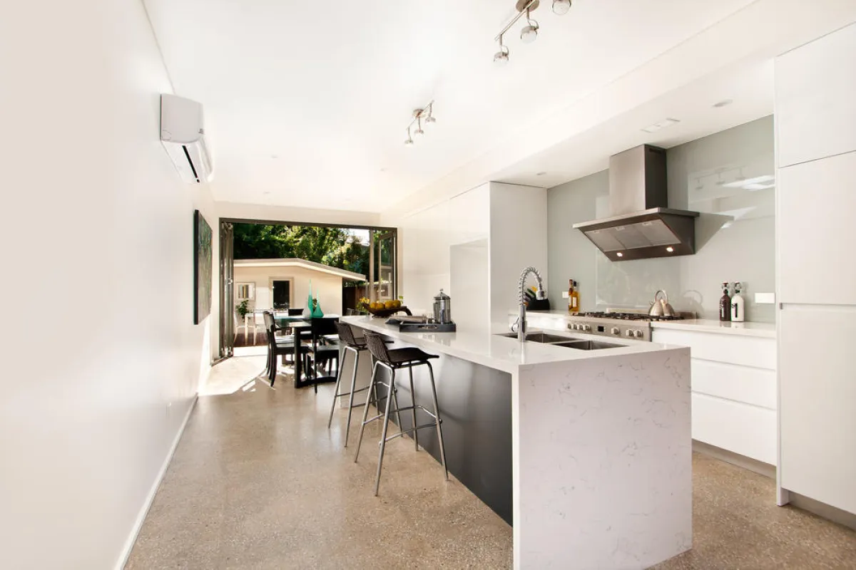 7. في إطار تصميم مطابخ "مودرن" جذابة، تُرتَّب الجلسة الملحقة، بحيث تكون كراسيها وثيرة، كما تُثبَّت شاشة التلفاز في المكان.