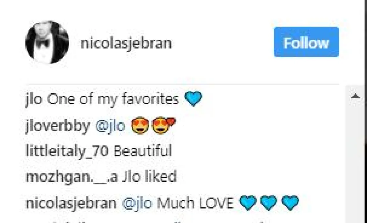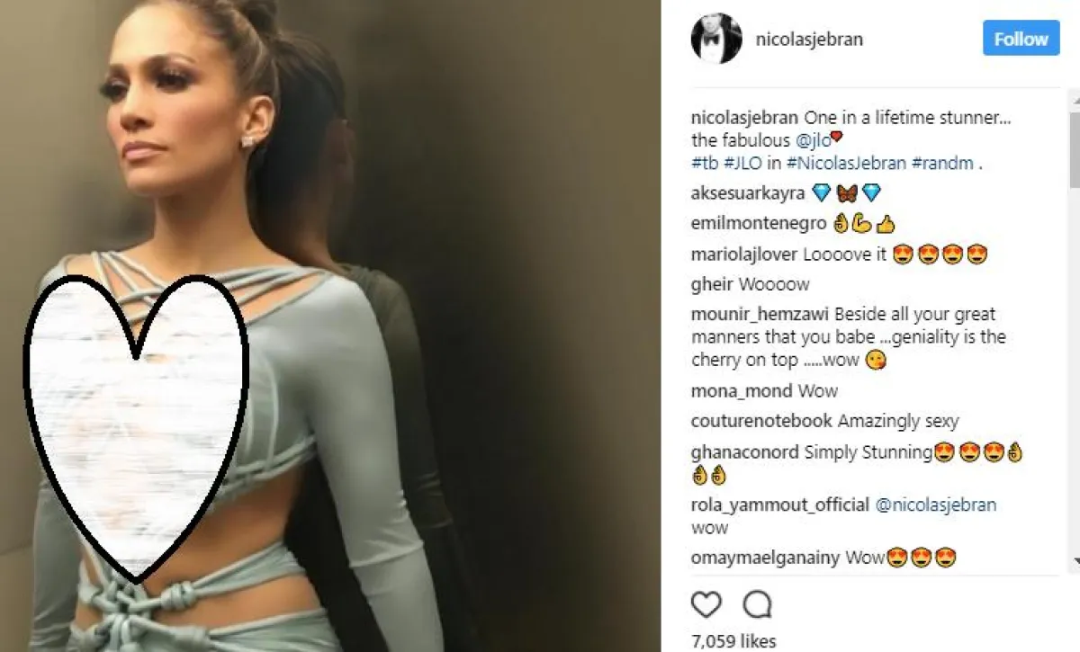 نشر مصمم الأزياء اللبناني الشهير نيكولا جبران عبر حسابه على أحد مواقع التواصل الاجتماعي صورة للنجمة العالمية جينيفر لوبيز Jennifer Lopez، وهي ترتدي ثوباً من تصميمه.