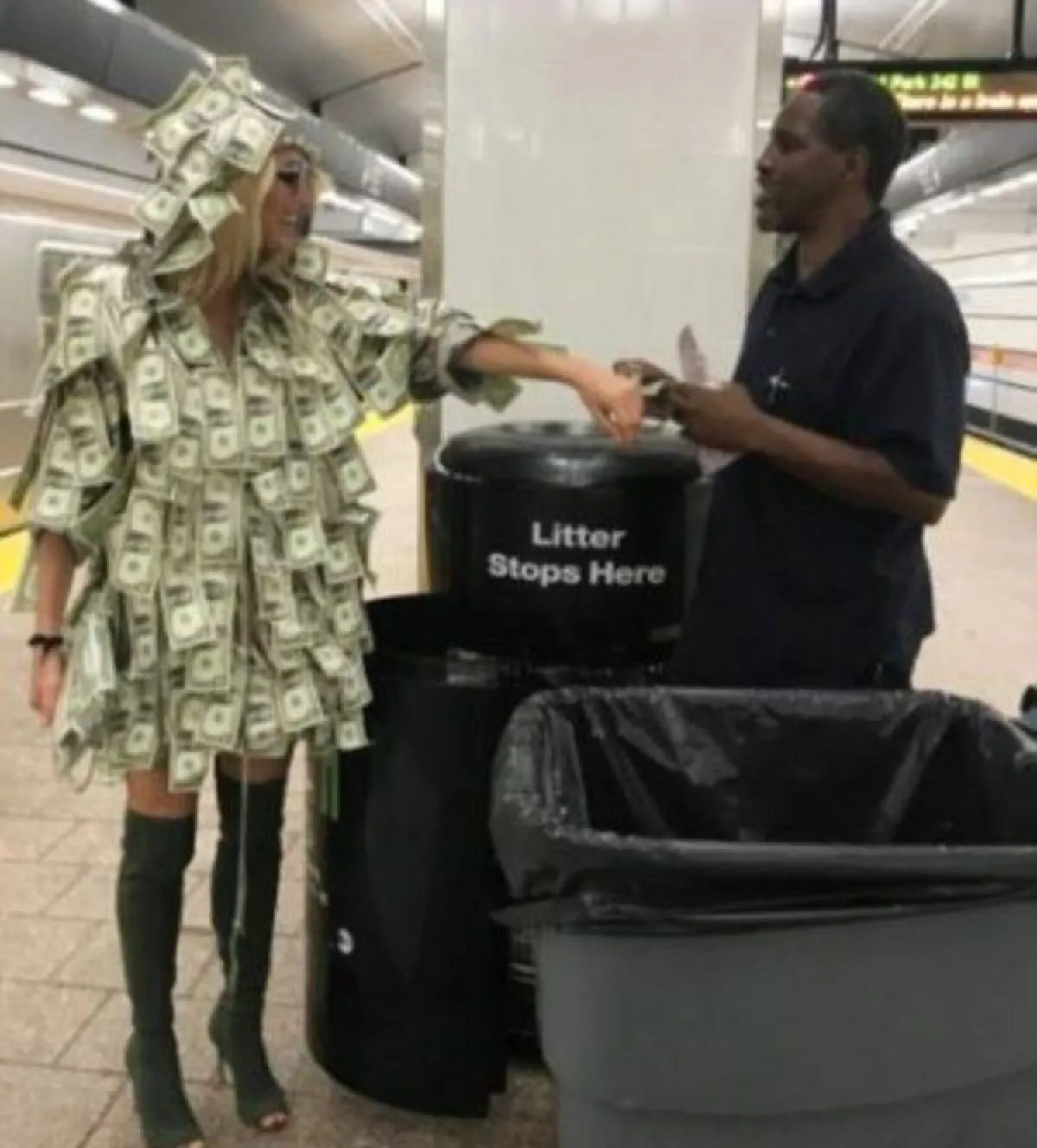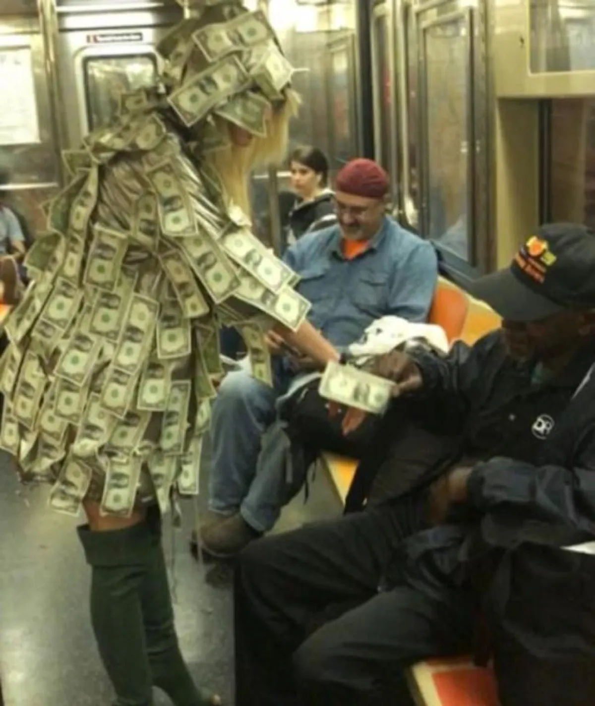 وقالت فيكتوريا إنها ارتدت هذا الثوب بحيث يمكن للناس أخذ ما يحتاجون إليه من المال، وحتى يتمكن الغرباء والفقراء في مترو الأنفاق والشوارع من التقاط المال في محاولة لمساعدة الآخرين.