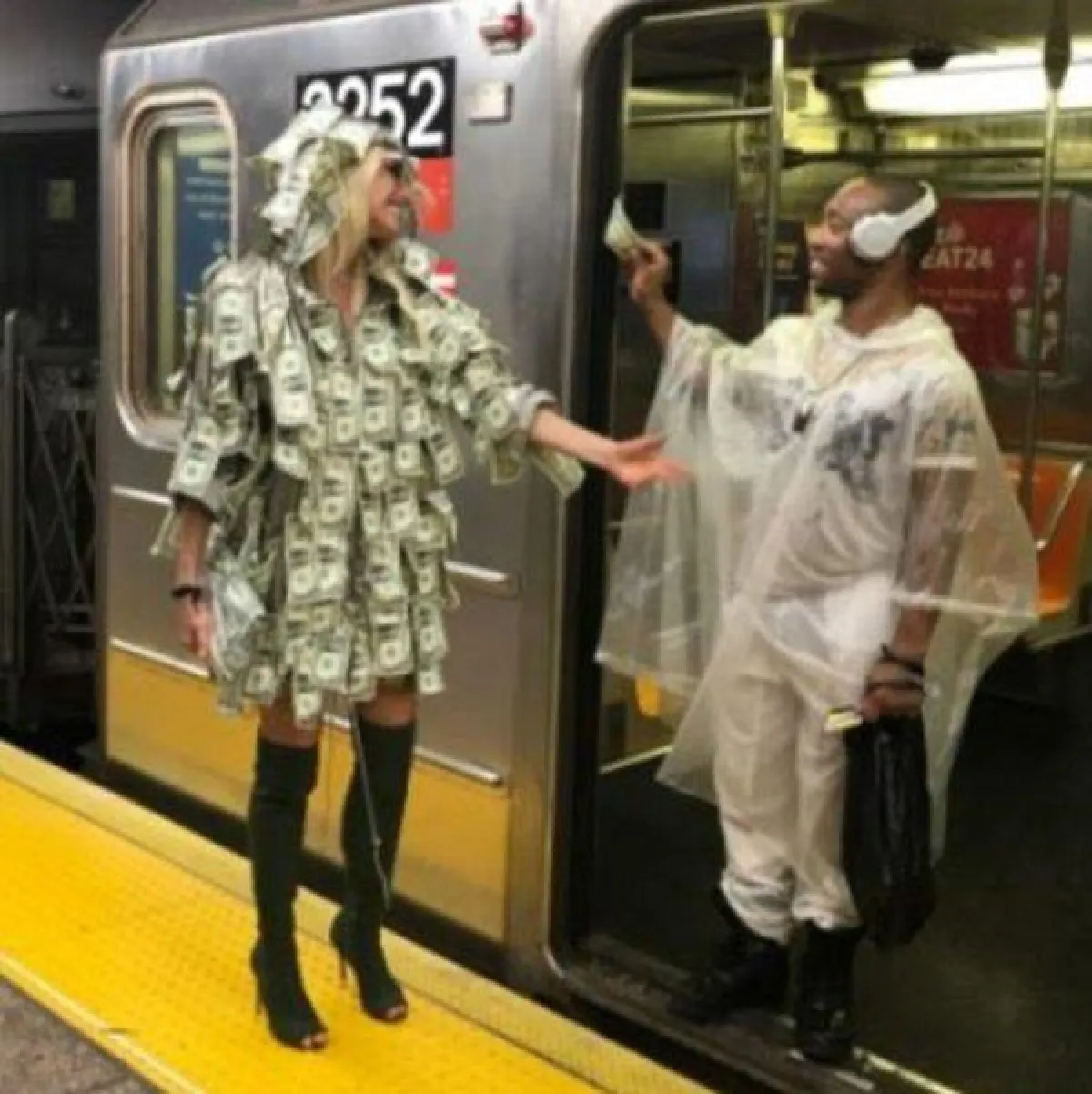 وارتدت عارضة أزياء مجلة "بلاي بوي"، البالغة من العمر 31 عاماً، فستانًا مغطى بشكل كامل بالأوراق المالية "الدولارات"، وتجولت مشياً على الأقدام في شوارع مدينة نيويورك.