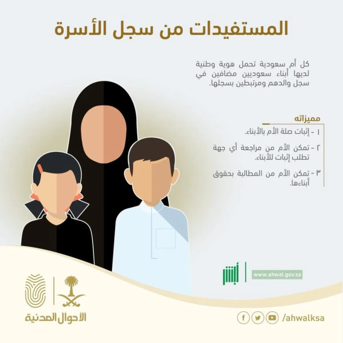- تمكُّن الأم من مراجعة أي جهة لطلب إثبات الأبناء.