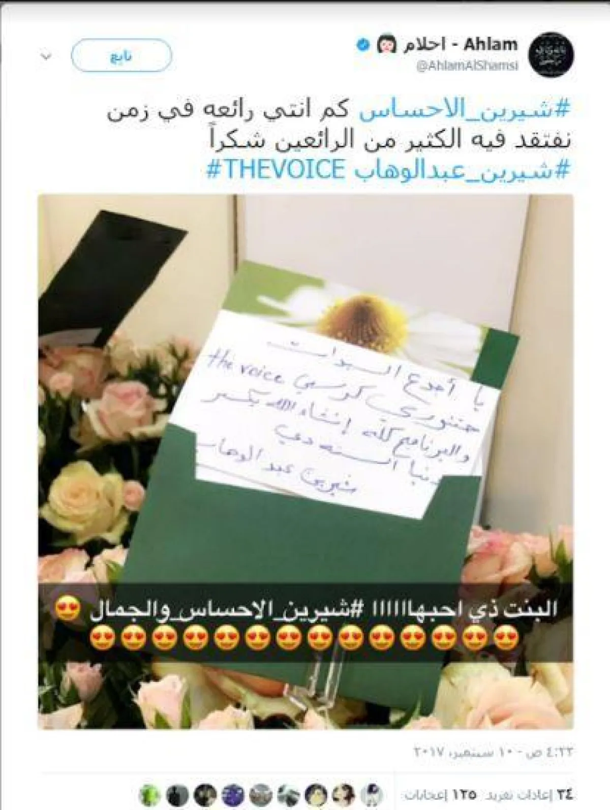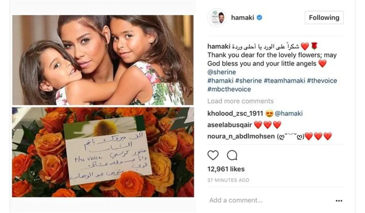 في لفتةٍ رقيقة من المطربة شيرين عبد الوهاب، قامت بإرسال باقات الزهور للأعضاء الجدد في لجنة تحكيم برنامجها السابق "ذا فويس" ، إليسا ومحمد حماقي وأحلام، وعلى الفور قام الثلاثي برد التّحية لشيرين .. بأحسن منها!!