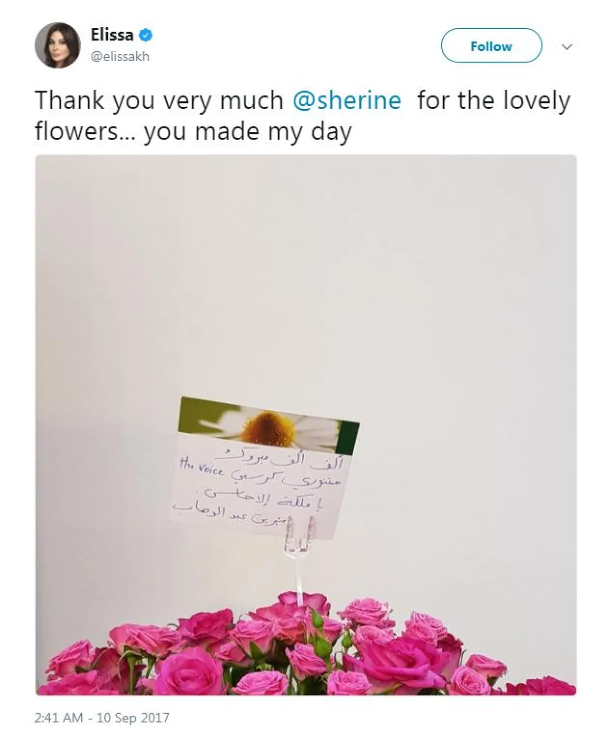 إليسا نشرت صورةً لباقة ورد، عبر حسابها الشخصي بموقع "تويتر"، وكُتب على كارتٍ بداخلها "ألف ألف مبروك نورتي كرسي ذا فويس يا ملكة الإحساس"، وعلّقت إليسا على الصورة: "شكراً يا شيرين على باقة الورد أسعدتيني".