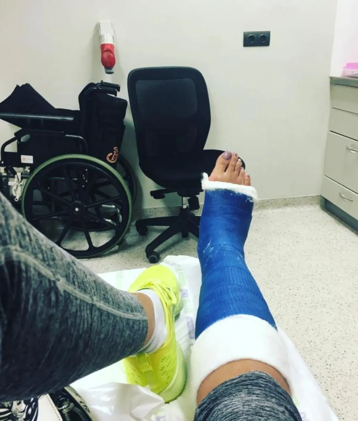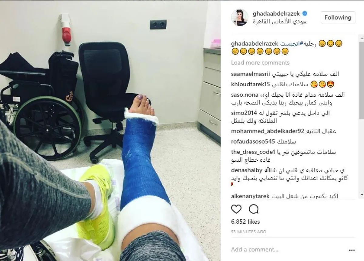 نشرت الفنانة غادة عبد الرازق، صورة جديدة لها، كشفت فيها عن وجودها داخل المستشفى السعودي- الألماني بالقاهرة، بسبب إصابتها بكسر في القدم، وبدت قدمها في الصورة محاطة بجبيرة من الجبس، مع غطاء واقٍ يمتد لمنتصف الساق.