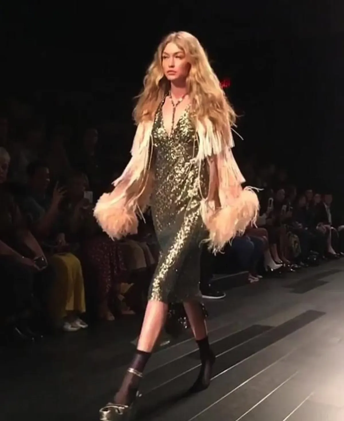 وفي التفاصيل ان "جيجي" Gigi خرجت لتعرض آخر تصميم وهي تنتعل حذاء واحد فقط ذو كعب عالي جداً ،فيما القدم الأُخرى كانت حافية مما اضطرها للمشي على اطراف أصابعها للتوازن، وقد نجحت بذلك وبدت متألقة بالرغم من صعوبة المشي بحذاء واحدة.