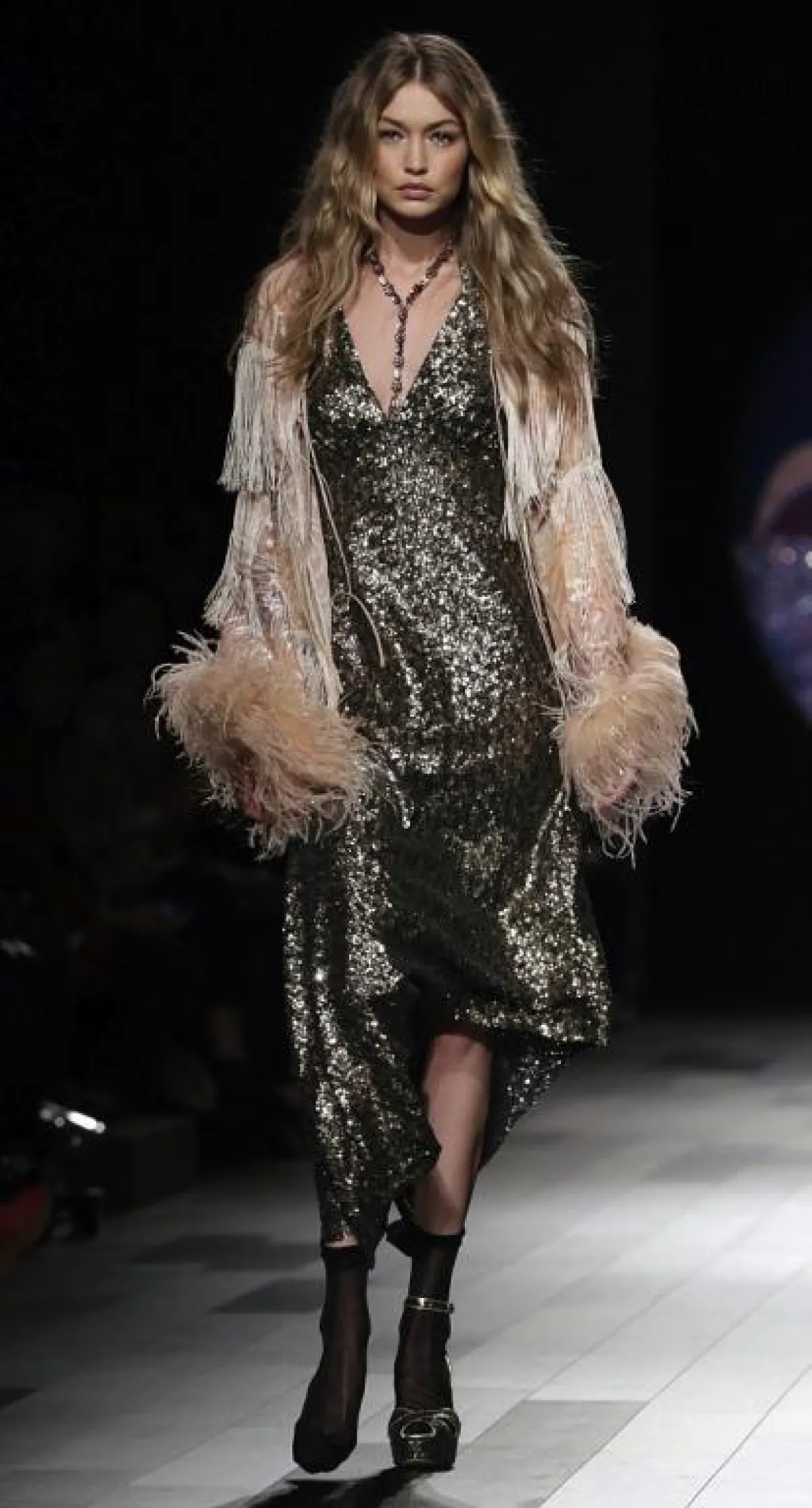 شاهدي الفيديو المرفق في الدقيقة الـ 13 لتشاهدي كيف سارت "جيجي حديد" Gigi Hadid بفردة حذاء واحدة.