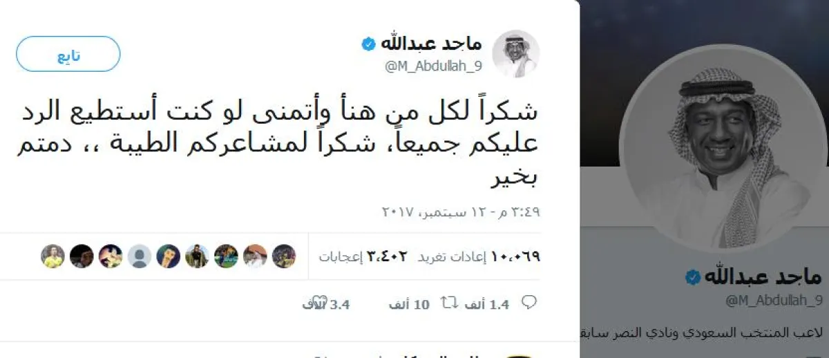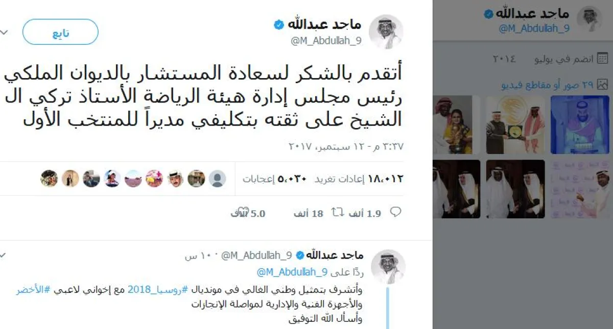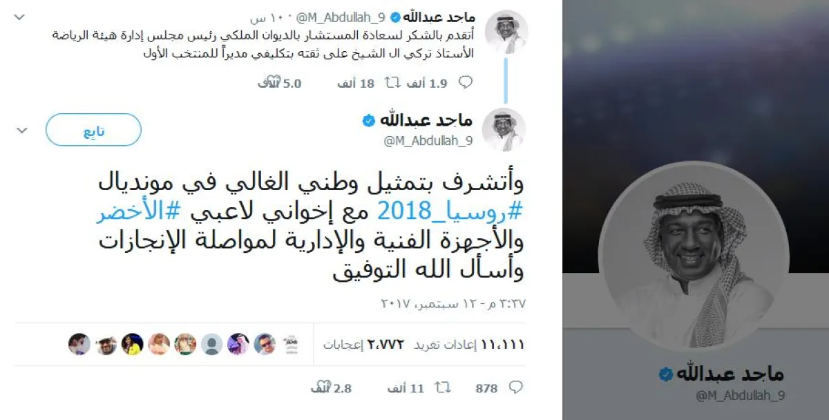 وغرد ماجد عبدالله عبر حسابه في "تويتر" بقوله: "أتشرف بتمثيل وطني الغالي في مونديال #روسيا_2018 مع إخواني لاعبي #الأخضر والأجهزة الفنية والإدارية لمواصلة الإنجازات، وأسأل الله التوفيق".