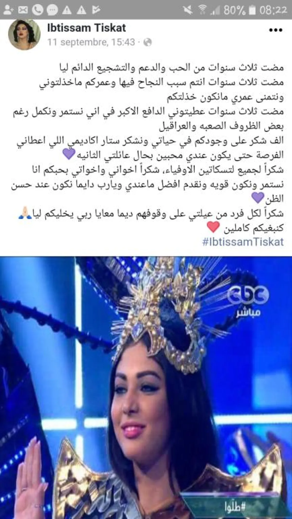 وعلقت ابتسام على الصورة التي مر عليها ثلاث سنوات قائلة: "مضت ثلاث سنوات من الحب والدعم والتشجيع الدائم ليا، مضت ثلاث سنوات انتم سبب النجاح فيها وعمركم ماخذلتوني ونتمنى عمري ما نكون خذلتكم، مضت ثلاث سنوات عطيتوني الدافع الأكبر في أني نستمر ونكمل رغم بعض الظروف الصعبة والعراقيل"