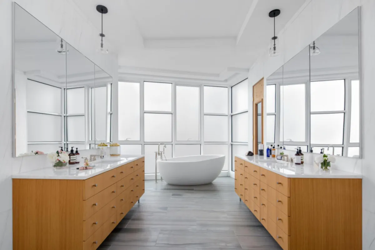 من جهة ثانية، إنّ تصميم المطبخ مشغول بإتقان بالغ، حيث الخشب الفاتح يتناغم مع قطع الـ"ستاينلس ستيل". مكوّنات غرفة الطعام تقتصر بدورها، على طاولة مستطيلة معدّة من الخشب الفاتح، تحوطها كراسٍ مكسوة بالقماش الرمادي. وتزدان الجدران بلوحتين تجريديتين ضخمتين. وفي غرفة النوم الرئيسة، يتشارك الرمادي الأسود في طبع المساحة بهويّة عصريّة. ويمتد الحمّام الرئيس على مساحة مستطيلة، ويضمّ زوجين من حوض الغسل مدمجين بخزائن الخشب، وتعلوهما مرآة من دون إطار. وبجوار النوافذ المغبّشة، يسترخي حوض الاستحمام الرخام.