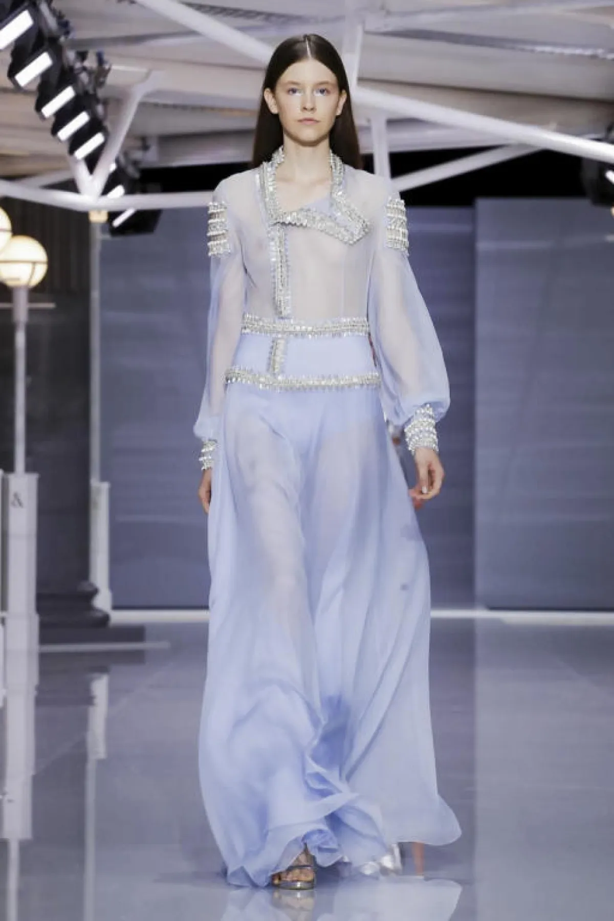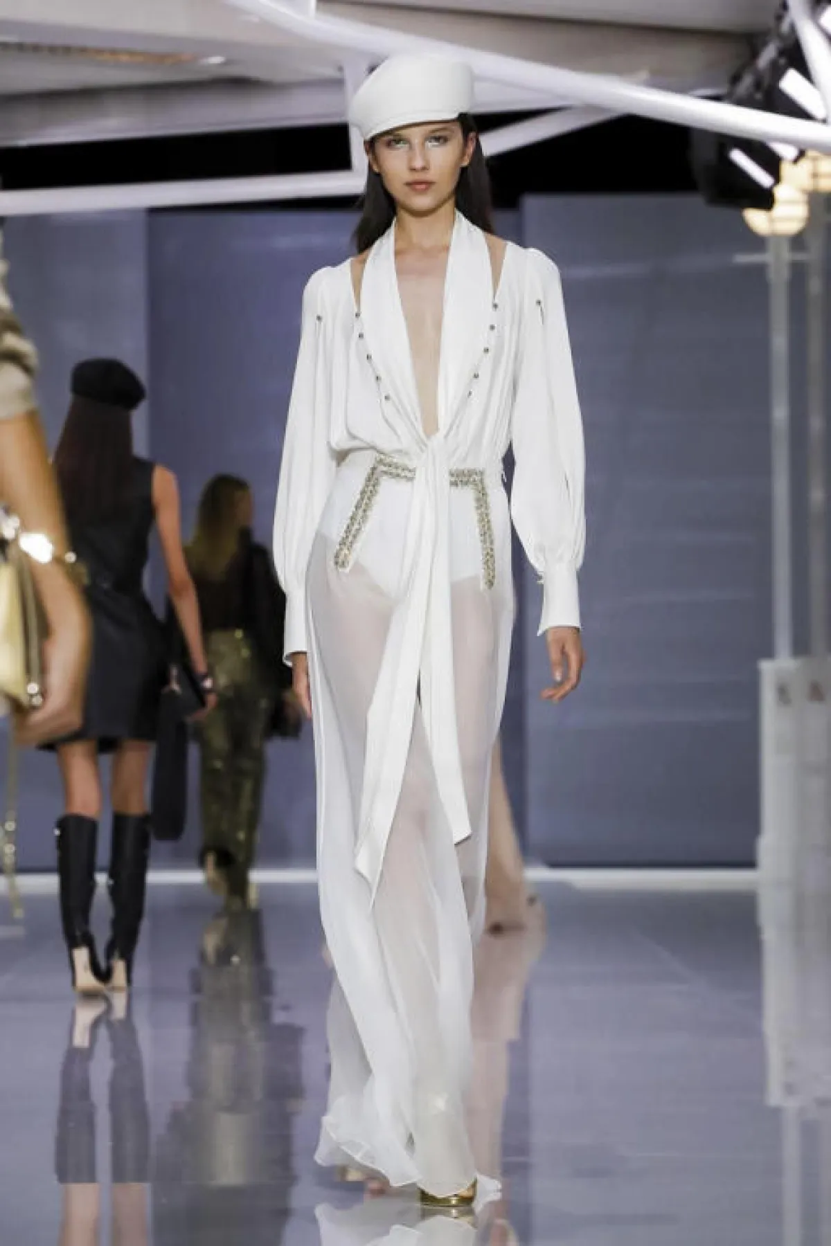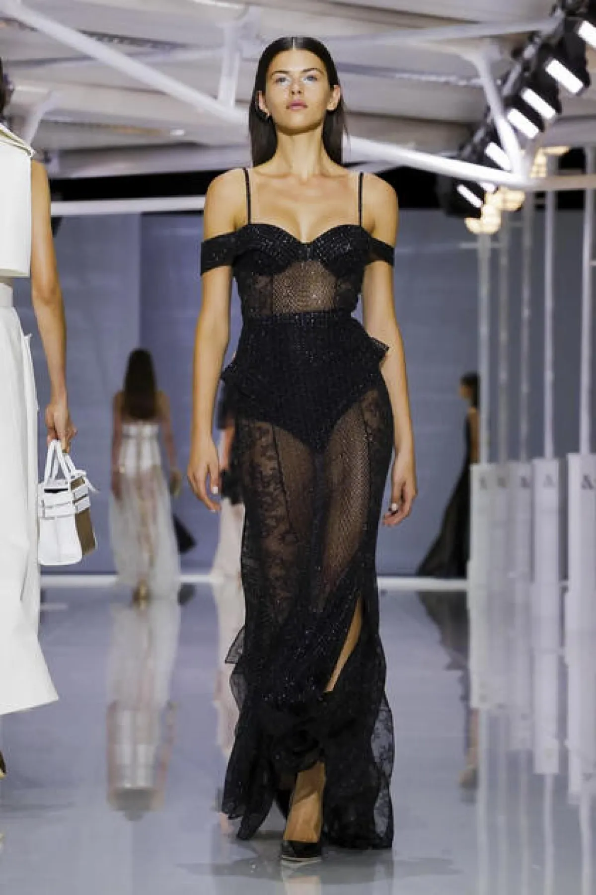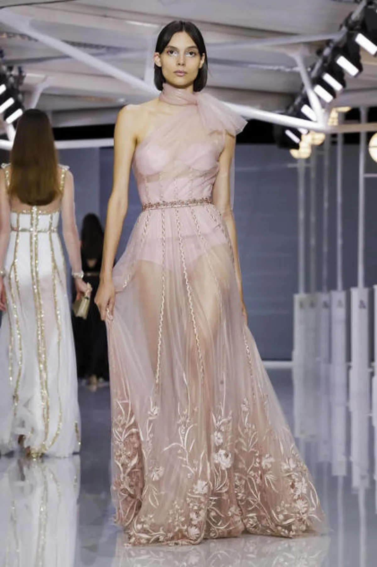 والملفت في عرض روسو الحزام على الخصر الذي يكشف أنوثة المرأة العصرية، أما الأقمشة فظهرت بالتول والشيفون والشفاف بألوان الأبيض والفضّي الميتاليك والملّونة بالورود.