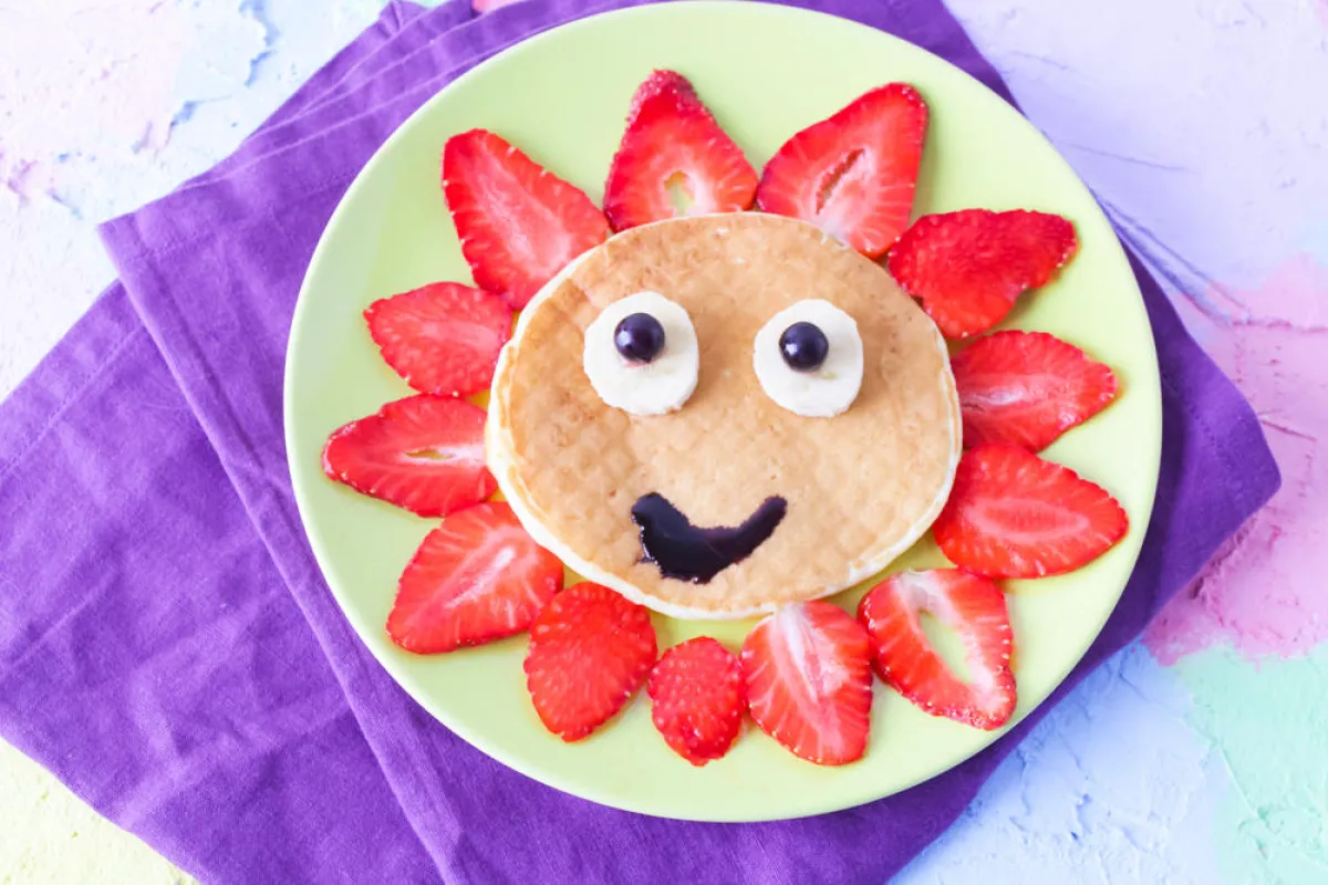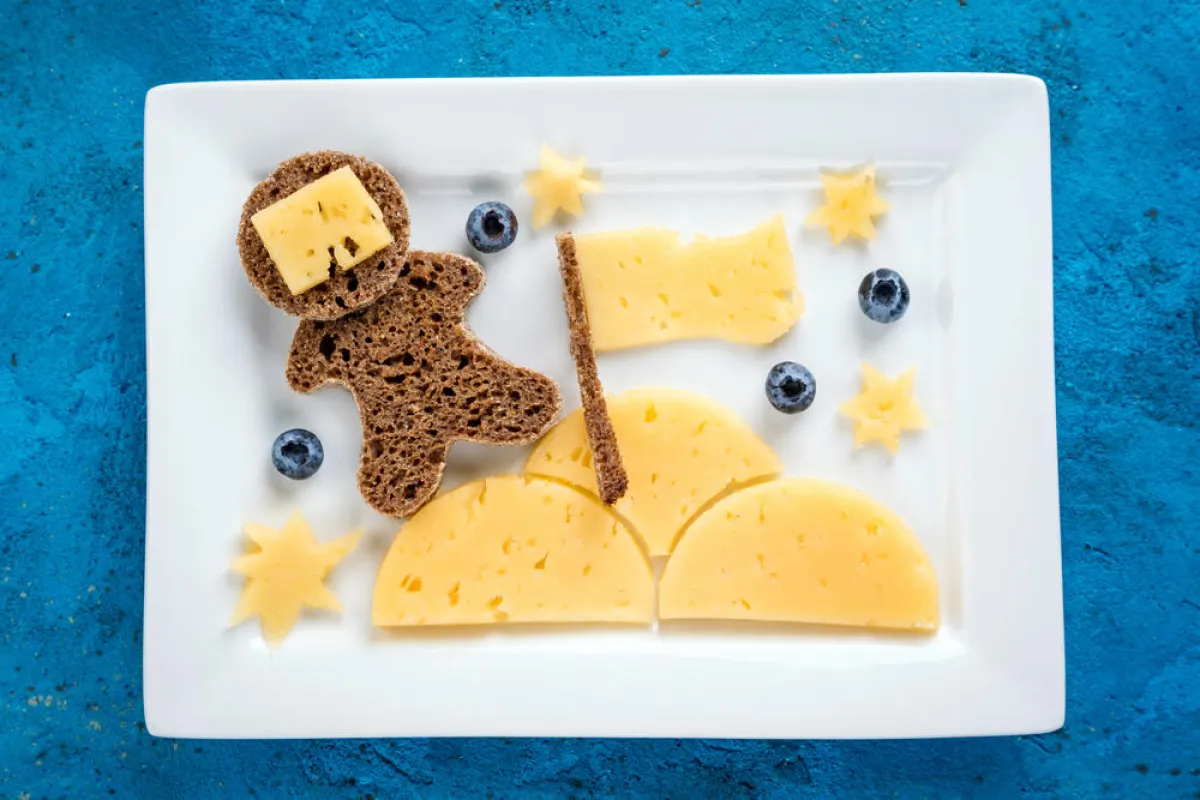 طبقتان من البسكويت بينهما قطعة جبنة دائرية، أحيطي البسكويت بأنصاف الفريز، واجعلي العينين من الجبنة وحبة البلو بيري، أما الفم فمن الشوكولاته السائلة.