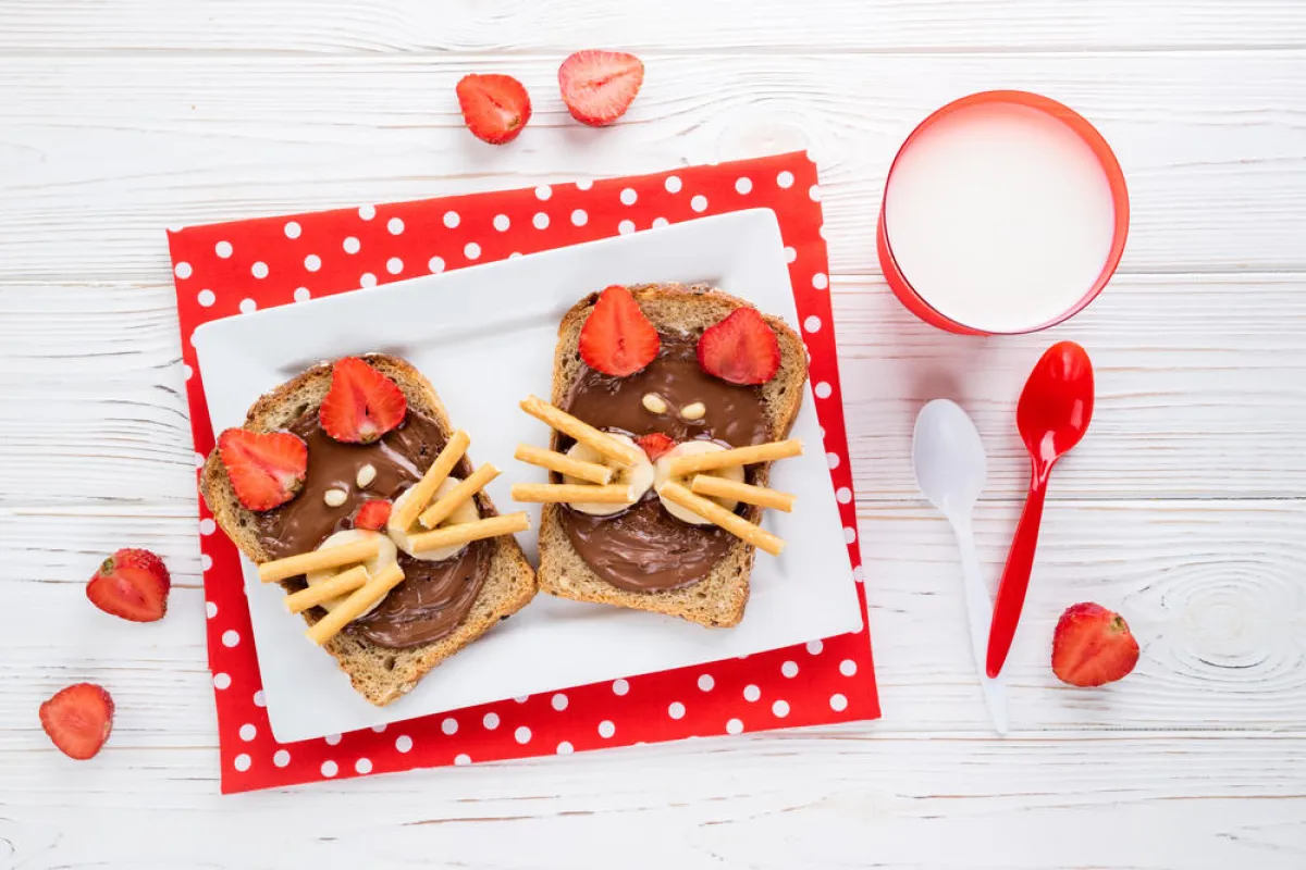 شريحتان من الخبز مدهونتان بالشوكولاته السائلة، الفم شريحتان من الموز، والشاربان عصي البسكويت، والأذنان من الفريز.