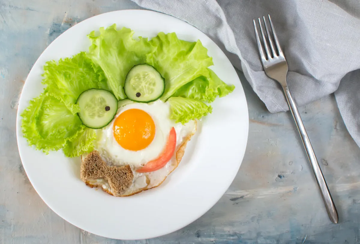 شريحة من خبز التوست، عليها بيضة مقلية على شكل عين، الفم قطعة طماطم، وفيونكة من الخبز على الجانب، أما الشعر فهو من عروق الخس، والعينان شريحتان من الخيار، ودائرتان من حبة البركة السوداء.