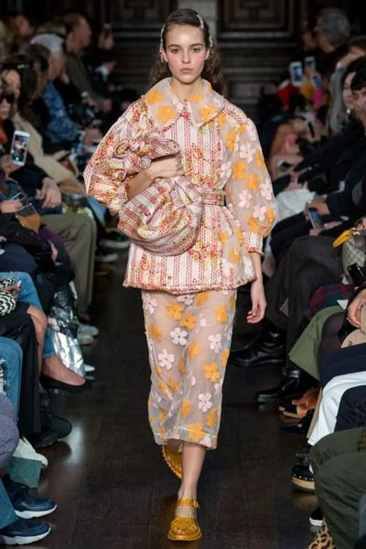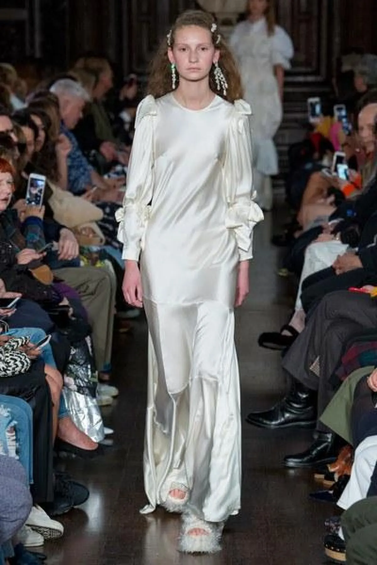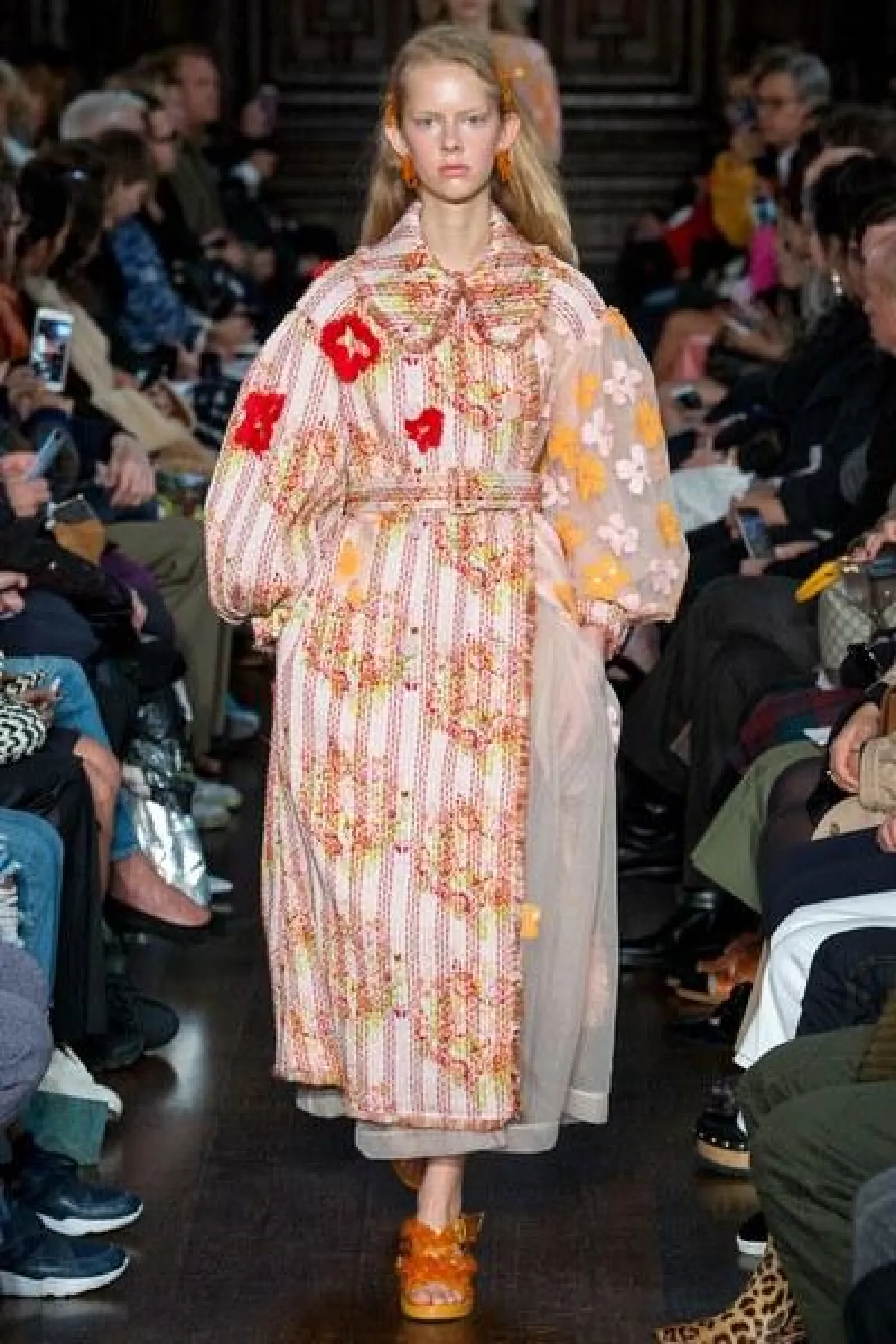 وبدت العارضات كالدمى الصغيرة التي ترتدي فساتين طويلة فضفاضة ذات الأكمام الواسعة والكبيرة عند الكتف.